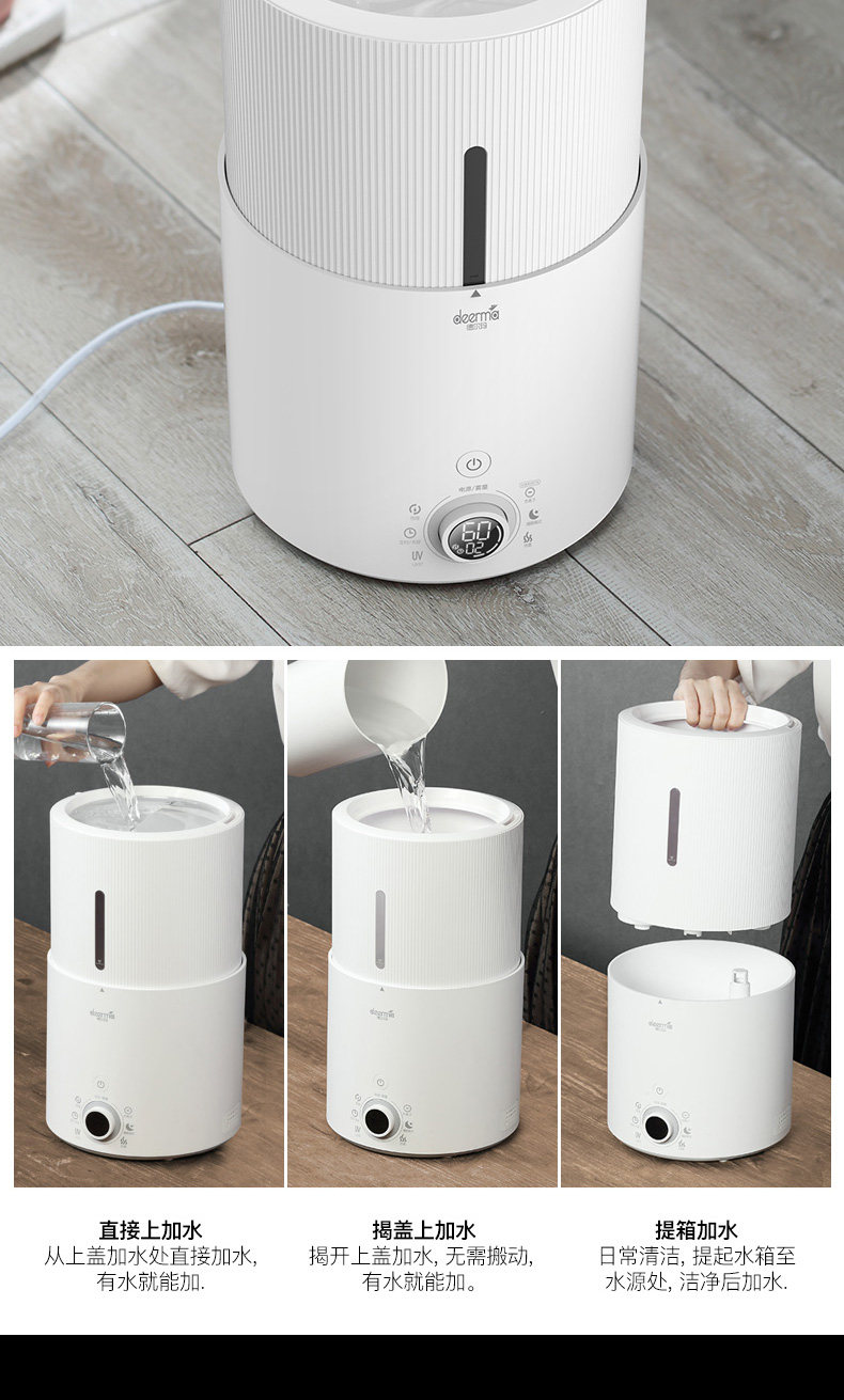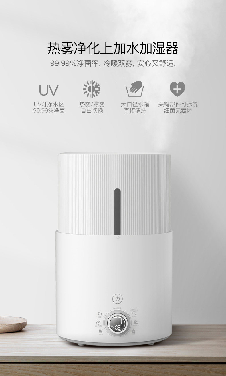 看了很多推荐和评价 买了带UV杀菌功能的 用着放心点 加湿器各种细节都做的非常精细 跟以前买的普通100来块的比 要高大上很多 机器下午到的办公室 开了两三个小时 同事说平时她加湿器测湿灯一直是黄色还是有点干燥 说明她的加湿器不行吧 我这个一开 灯直接变绿色了 超级推荐这款 加水也非常方便