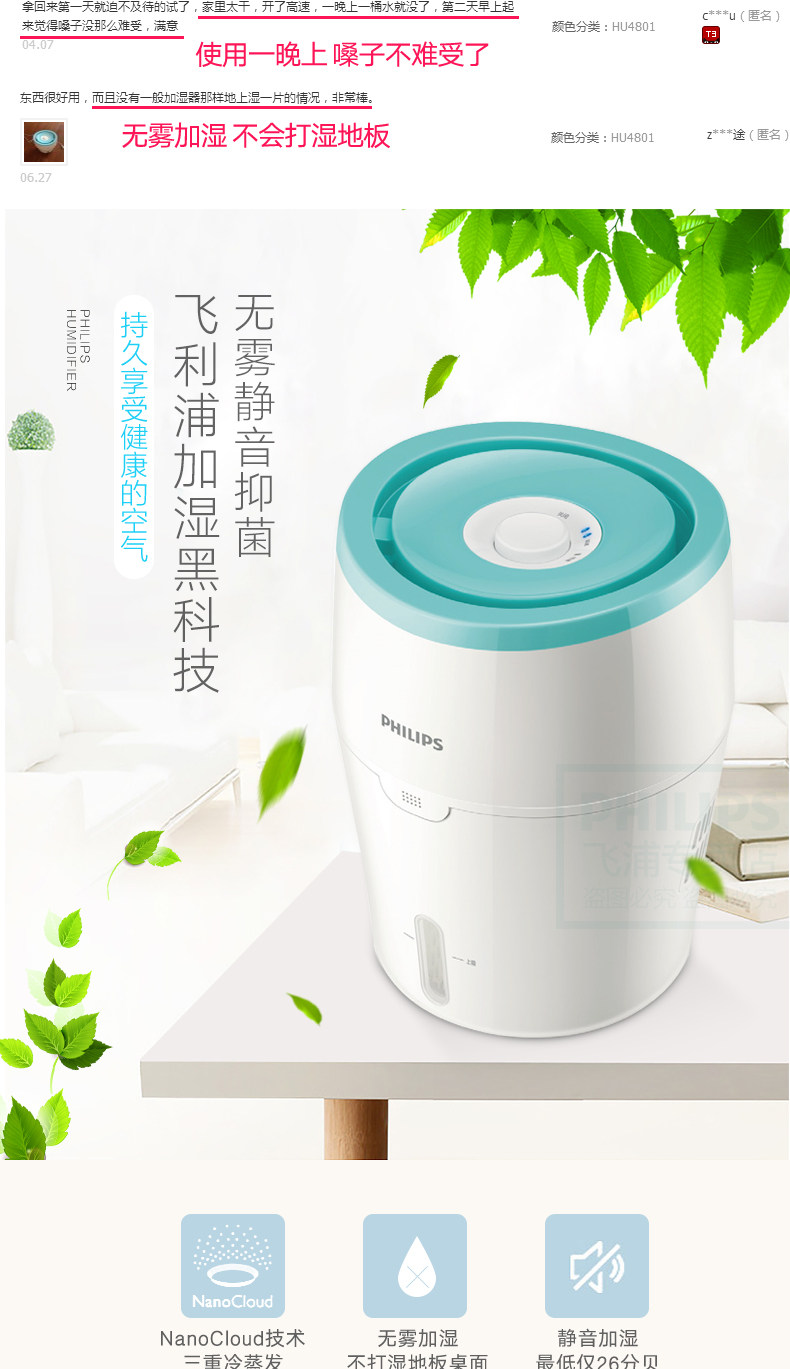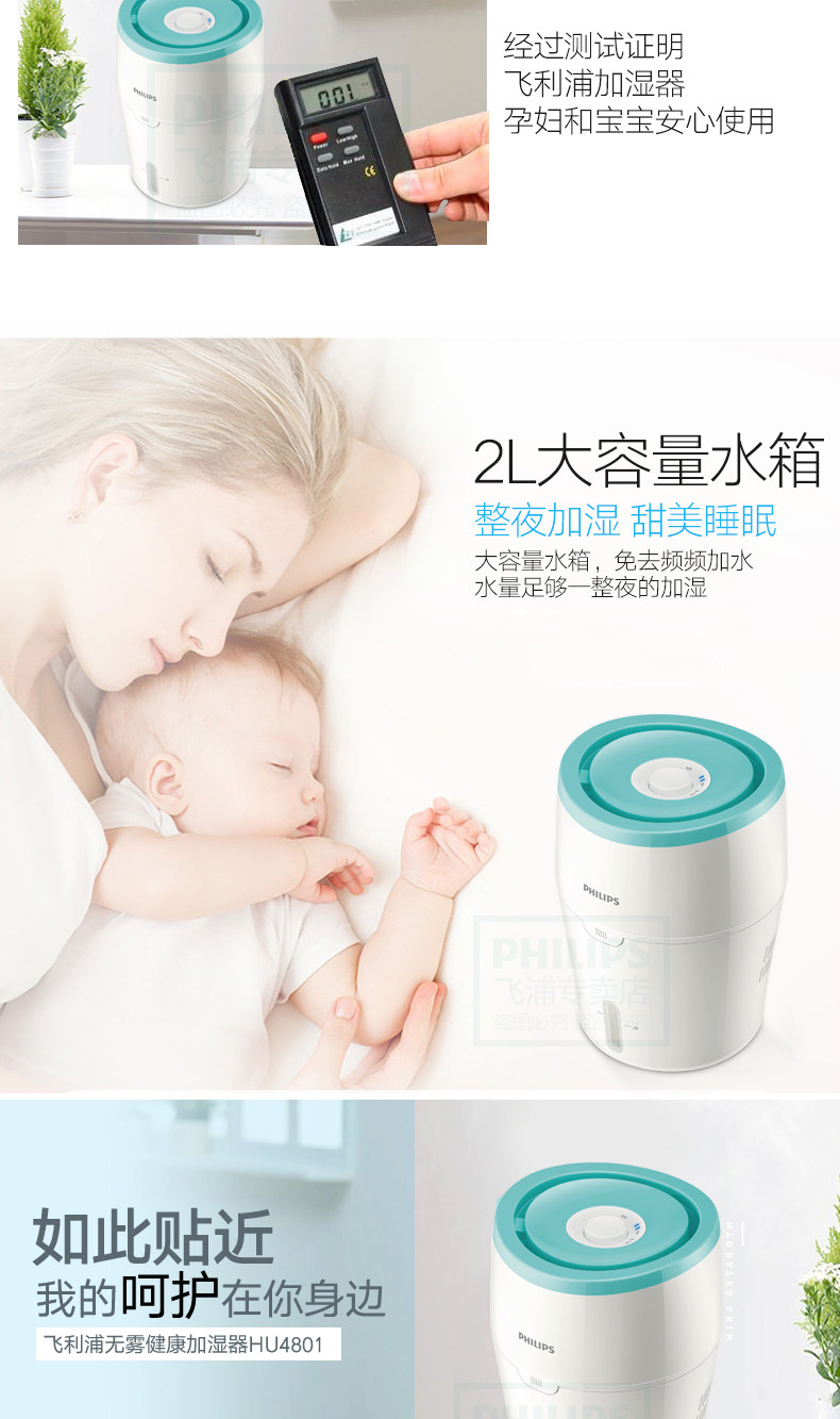 作为一个大品牌飞利浦加湿器真的是挺不错的,没有雾而且声音比别牌的加湿器要小很多啊,晚上开着也不影响睡眠,唯一的缺点就是那个照明上面的指示灯有点太亮了,晚上有点晃眼,也没办法找一个别的茶叶盒的盖子把它扣上也就没有事儿了。售后服务也特别的好,忘了发赠品,联系客服后立马给补发了这一点特别的满意。看评价有好多人说这个不是正品,我前几年在实体店买了个和这个一样的型号的飞利浦加湿器,感觉很好,这次买比店里买便宜了好多,而且对比了一下,这个绝对是正品。