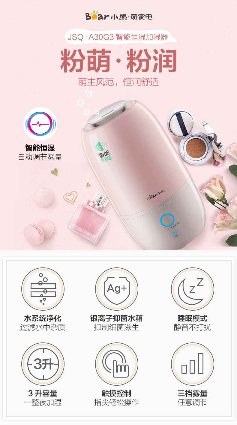 小熊有多款加濕机,粉色3升水葙适合自家需求,有自感调控及灯光显示功能,睡眠降低出务也行。內置香薰盒未滴入,后再试出味能力如何。