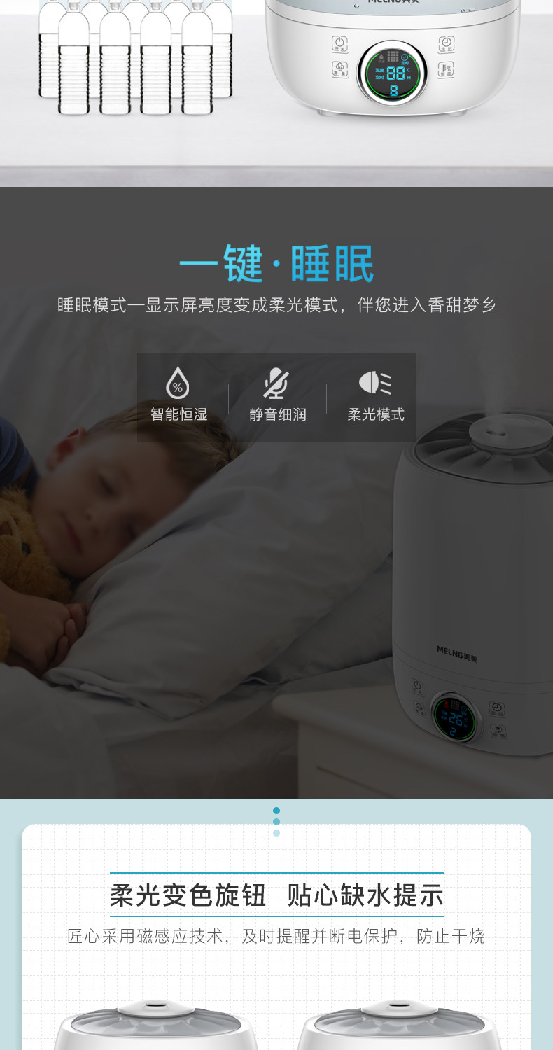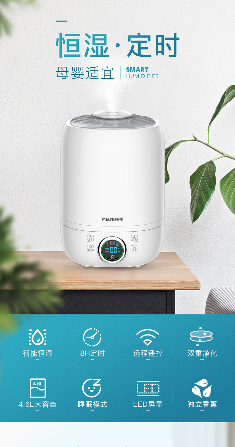 美菱这款的加湿器好的没话说,安装方便,操作简单,静音无噪音 清晰的电子显屏,遥控操作灵敏,出雾速度快、雾量大,能够智能加湿,还有定时、睡眠装置,而且价格便宜,是同类产品中比较好的一种, 现在几乎每晚都会用,很满意的一次购物。希望能够用得长久,推荐大家买。