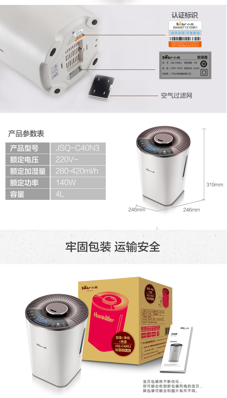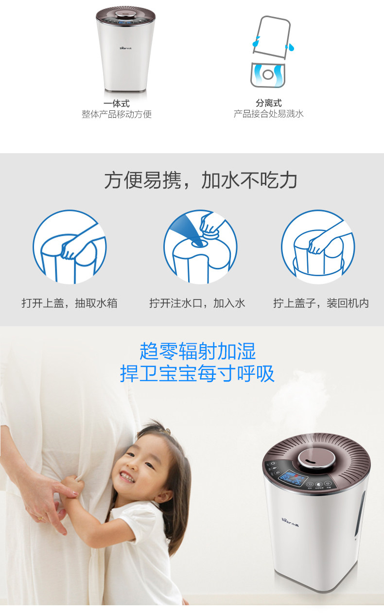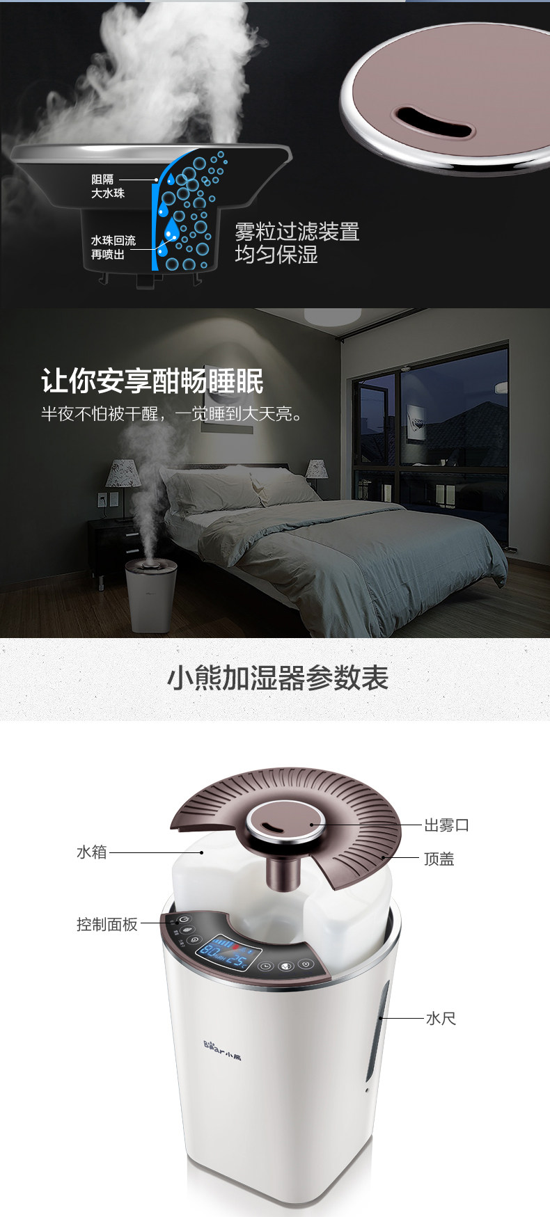 加湿效果:加湿六个档位方便调节 其他特色:很满意,加湿器一直用的小熊的,质量有保障。 这次购买的我很喜欢,颜值也很高,不是很复杂,简单易操作,看着美观大方,静音效果很好,用了一段时间总体满意,出雾量也可以。 选加湿器就选小熊的,用着安心,放心!