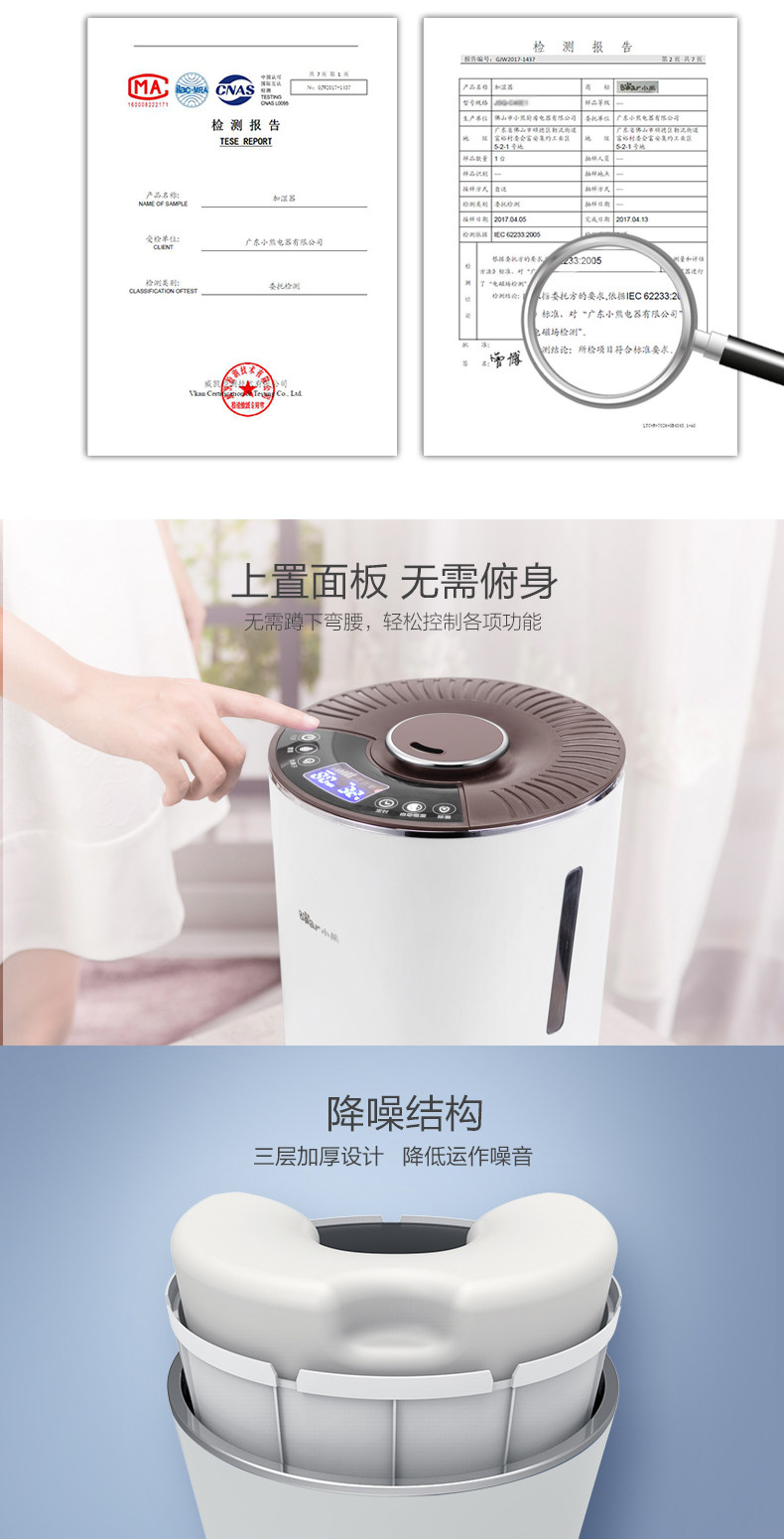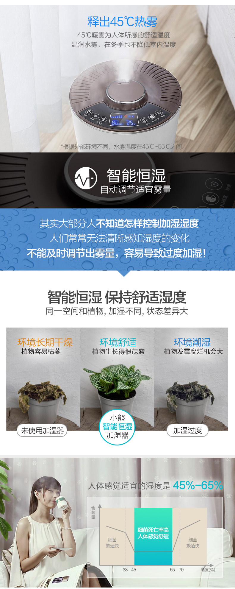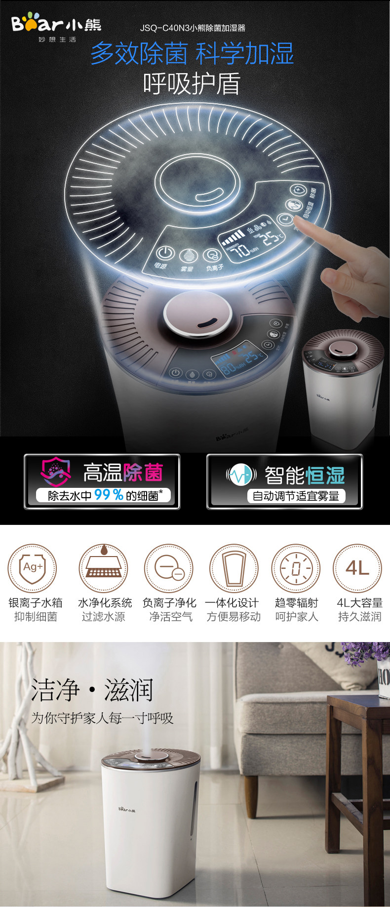 加湿效果:加湿六个档位方便调节 其他特色:很满意,加湿器一直用的小熊的,质量有保障。 这次购买的我很喜欢,颜值也很高,不是很复杂,简单易操作,看着美观大方,静音效果很好,用了一段时间总体满意,出雾量也可以。 选加湿器就选小熊的,用着安心,放心!
