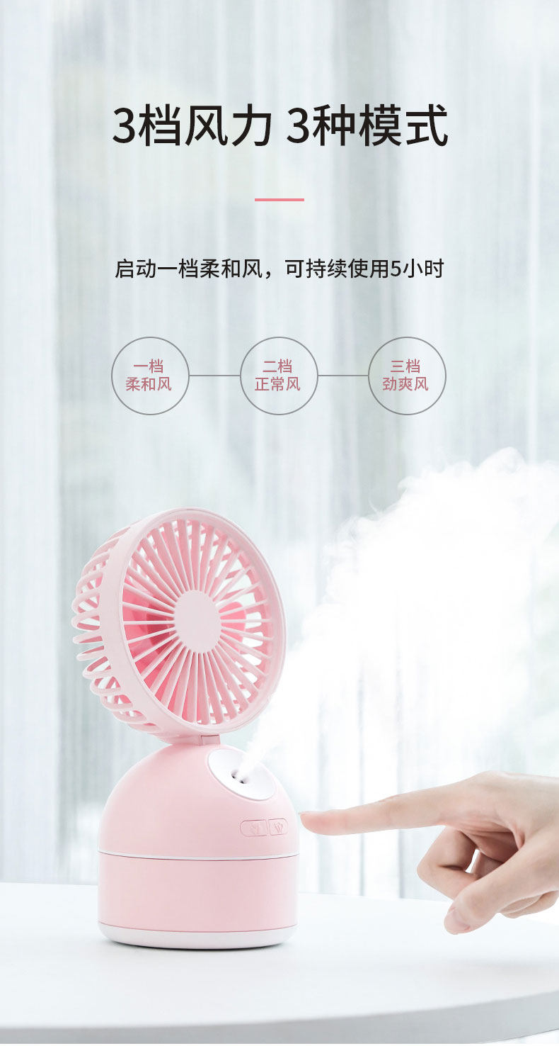 拿在手里很有质感,很可爱,很喜欢哈哈!试了喷雾,雾气很大,雾气均匀,天气干躁加些湿气,质量很好,物有所值,一共有三个功能档位真的很棒!风力真挺大的了,特别喜欢这个喷雾加湿的小功能,我这充电不是很方便一天充一次电,小风扇蓄电也能用很久!