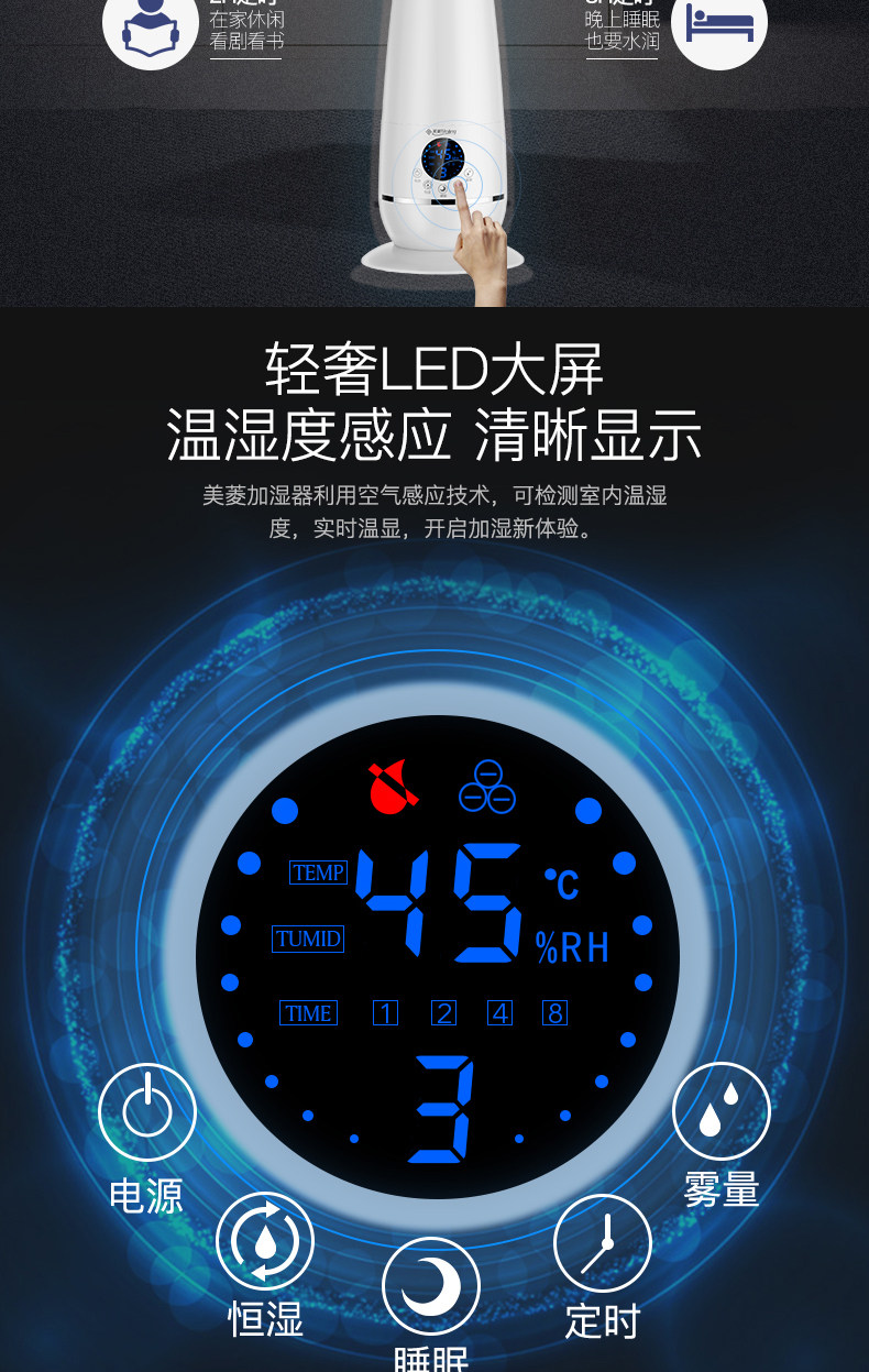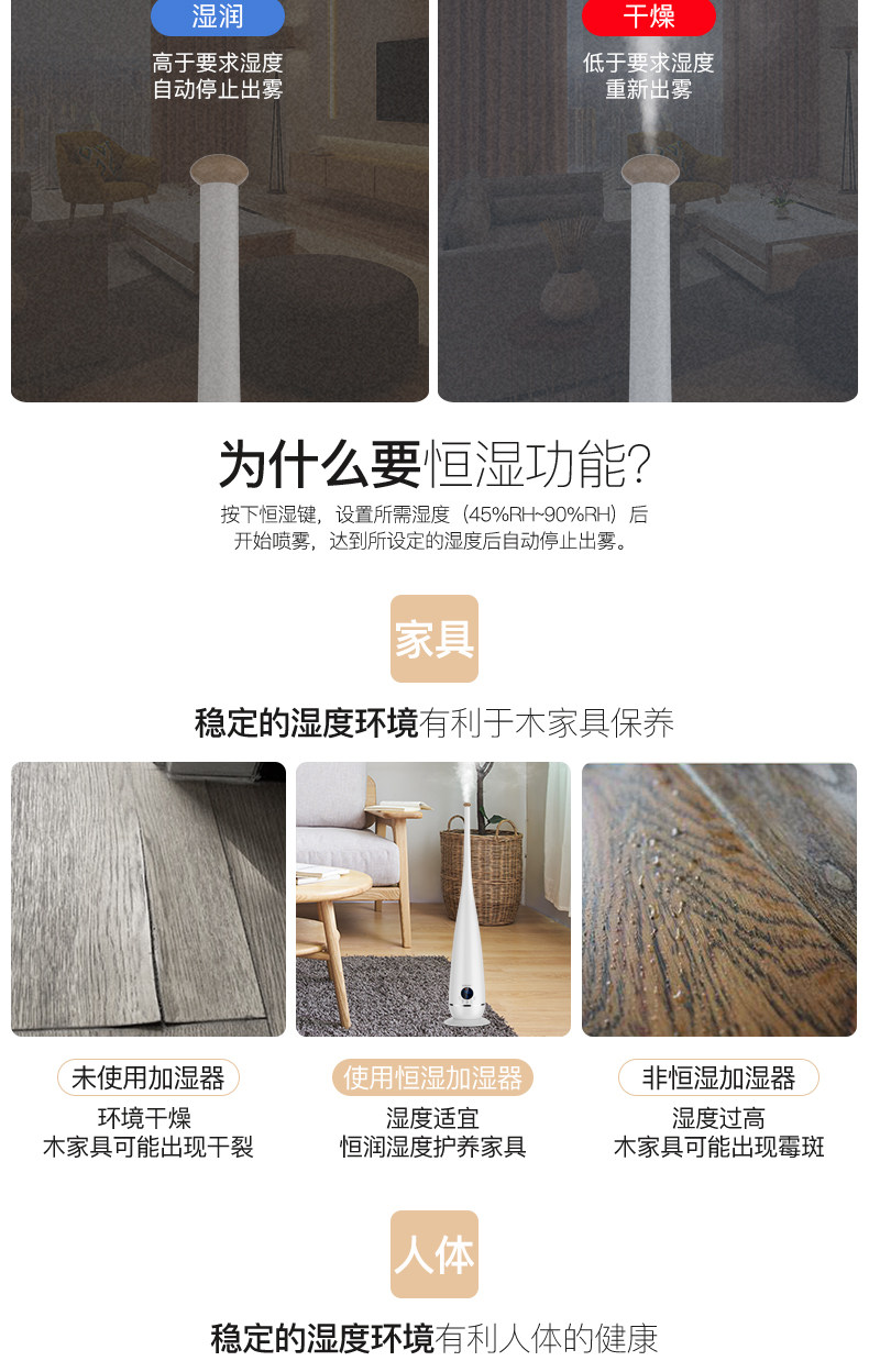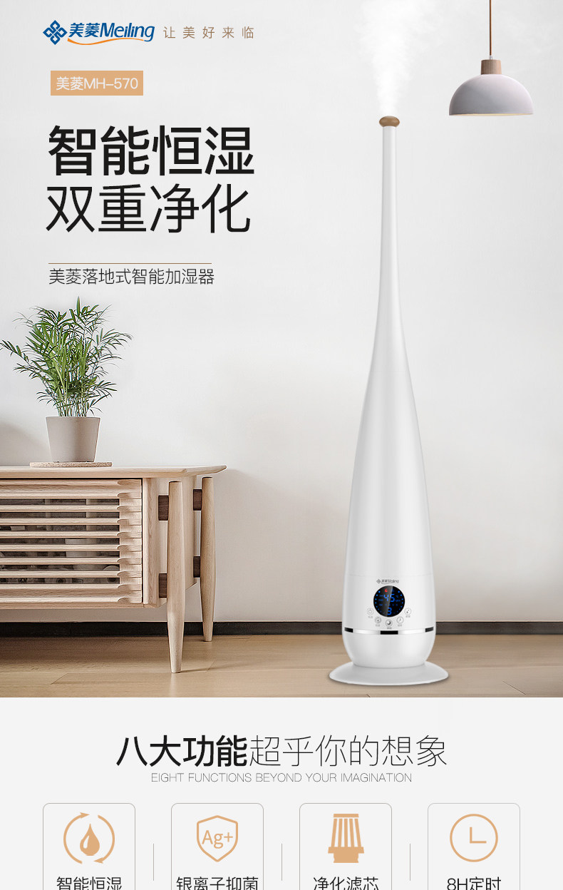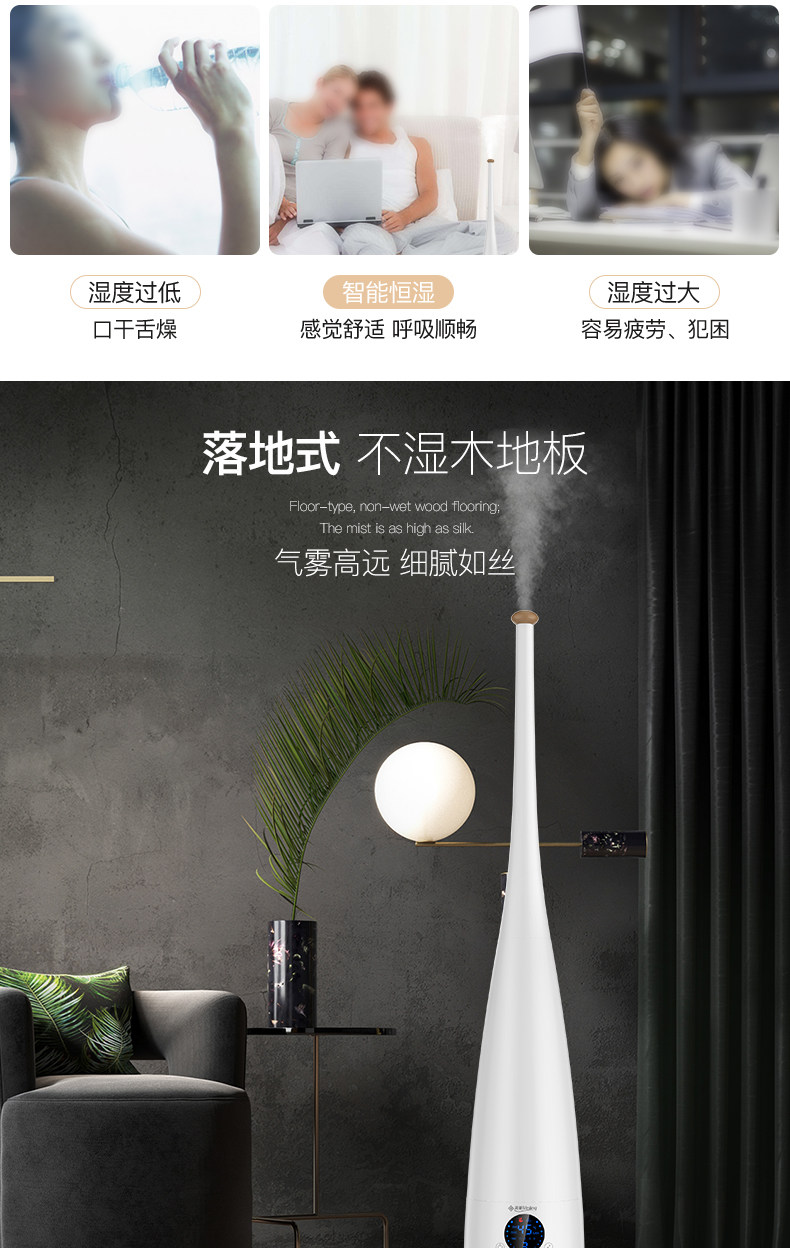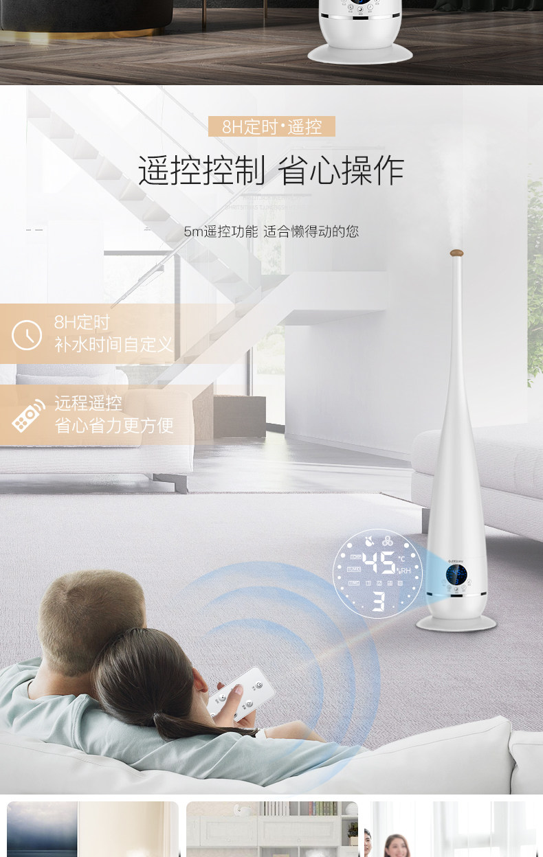 特别新颖的设计,雾量可以调节满足需求,智能遥控板很方便,特别适合北方的春秋天天气干燥使用,很满意的一次购物。