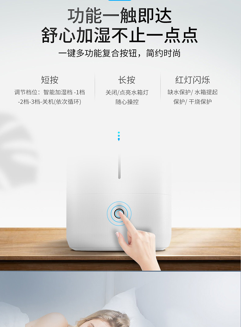 加湿器的颜值不错 这种直白的弧形水箱也比较容易清洗 重点是真的很安静 基本听不到声音 试了一下 加湿还是比较有效果的 受范围限制 就靠近加湿器那一块感觉比较不干 不过睡觉用够了 指示灯是可以全部关闭的 不影响睡眠 水雾比较细腻 靠近出雾口手上都不会粘上水珠 只有微凉的感觉 有一点建议 能增加一下具体档位显示就好了 经常要一个个键位地试 每个档位都按一遍后才能关机