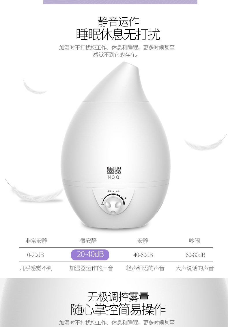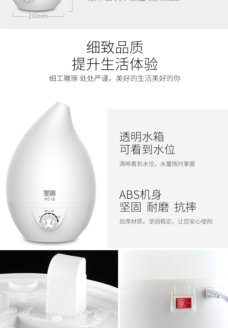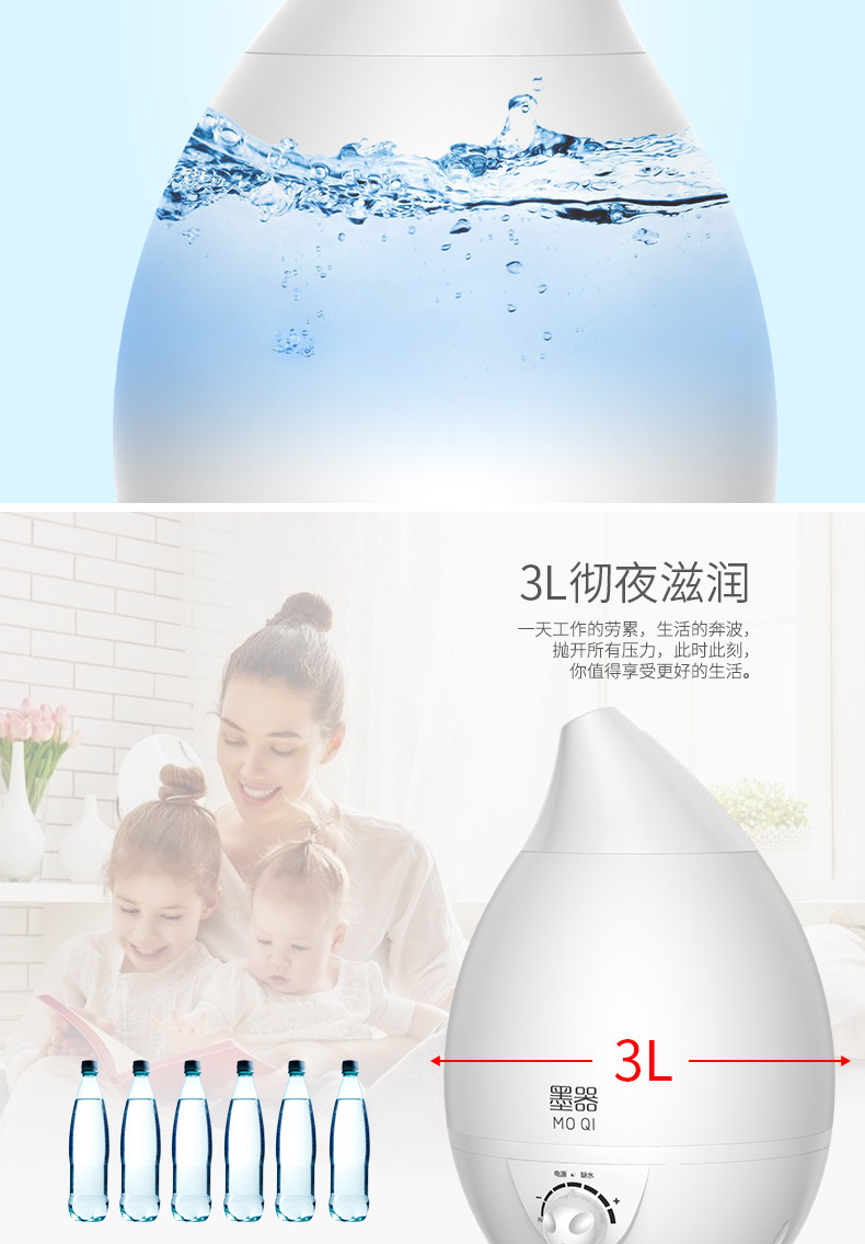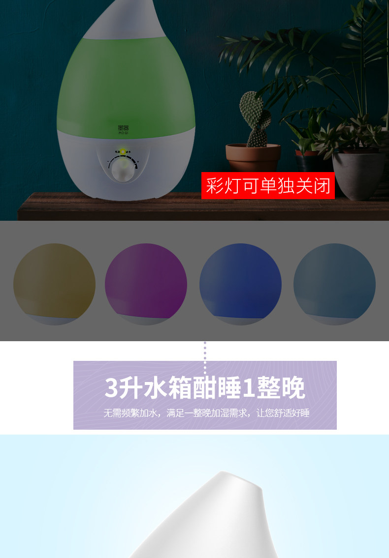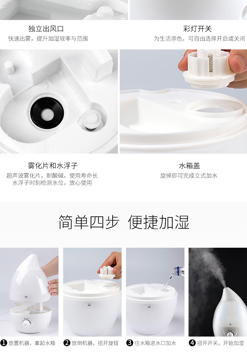 水箱容量:大 刚到货感觉不值这个钱,挺塑料的,不敦实。用着还是不错的,灯可开关,喷雾也可以,声音正常。水容量真的超级大