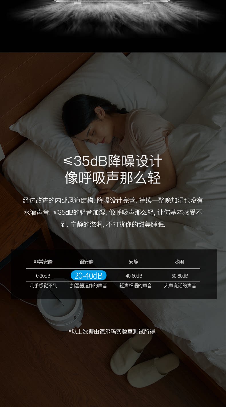 宝贝很好用,声音真的很小,放在孩子床头也没影响睡觉。加水很方便。桶里的灯常亮,还不知道怎么关,好在亮度很低。中档雾量,早上鼻子和嗓子不像以前那样干了。总体很满意。