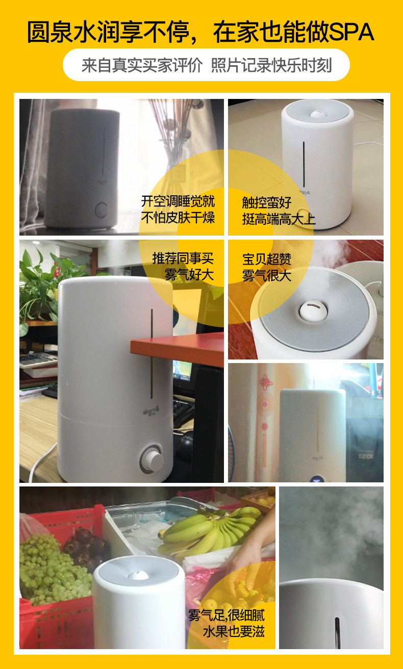 加湿效果:还好,因为有风扇吹,所以雾是向上走的,犹如不停的放屁一样源源不绝,噪音几乎不可闻,水箱容量大,可以用整天,外观洁白,价钱不贵,非常值得