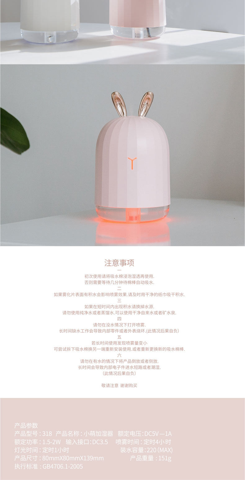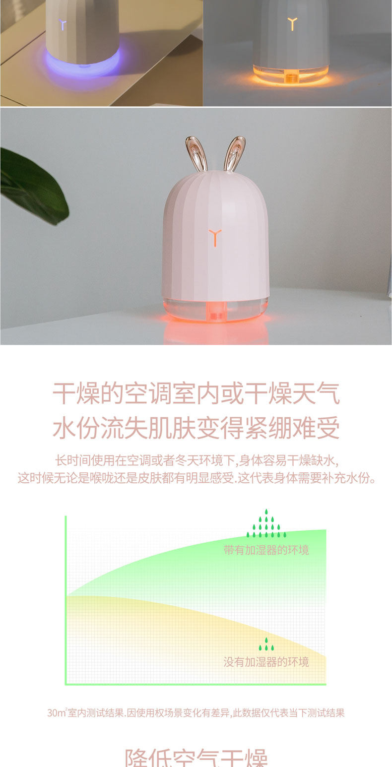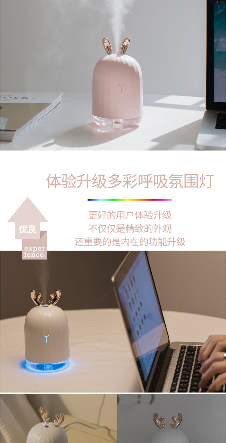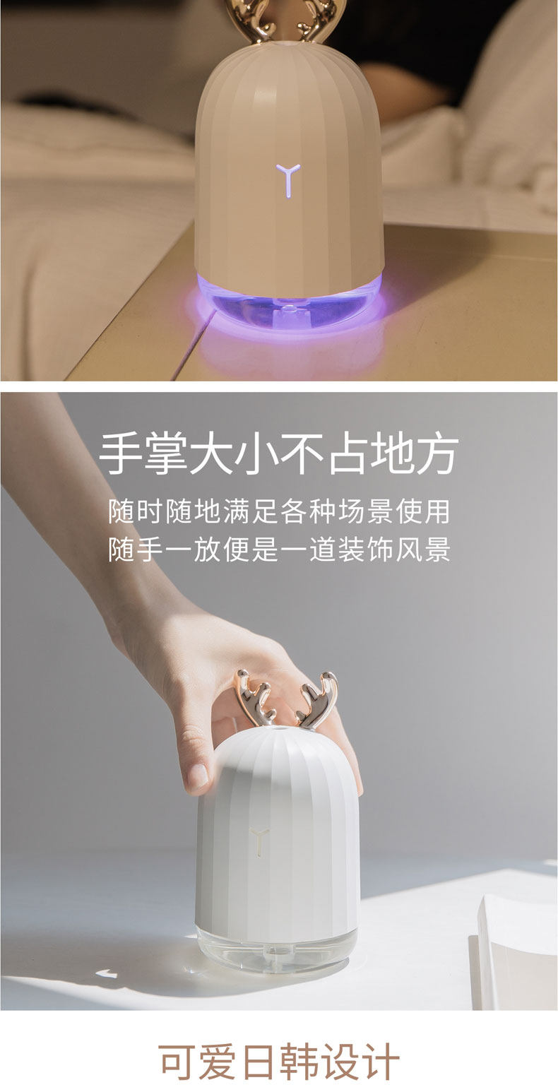 买的时候还怕有点小,没想到出雾量还可以,跟普通加湿器出雾量差不多,而且呼吸灯会一直变色,晚上开这个灯简直就是仙女的房间了,nice~