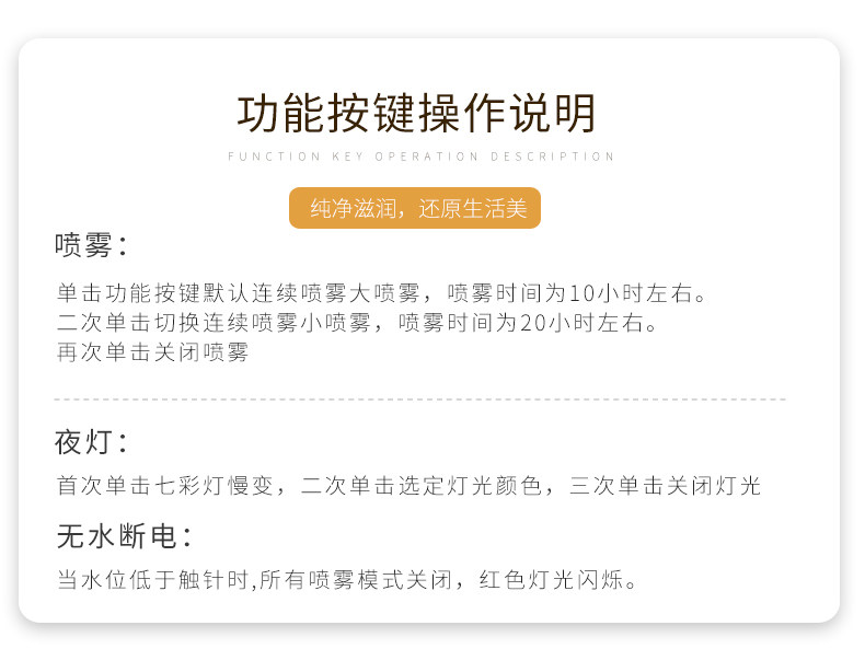 五星好评,用了一段时间之后发现,加湿效果非常不错,宿舍可以用,加满水可以用一晚!!