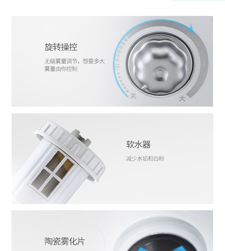 开了一下,没有什么其他响,用着非常好,家里有小孩用挺好的,指示灯太亮了,宝贝还是不错的,出雾量很大,第二天就到货了,搞活动买的,落地没有水,小开关到大出雾非常快的啦,包装减配了,挺好用的宝贝,雾很细腻,东西很好,老顾客了,