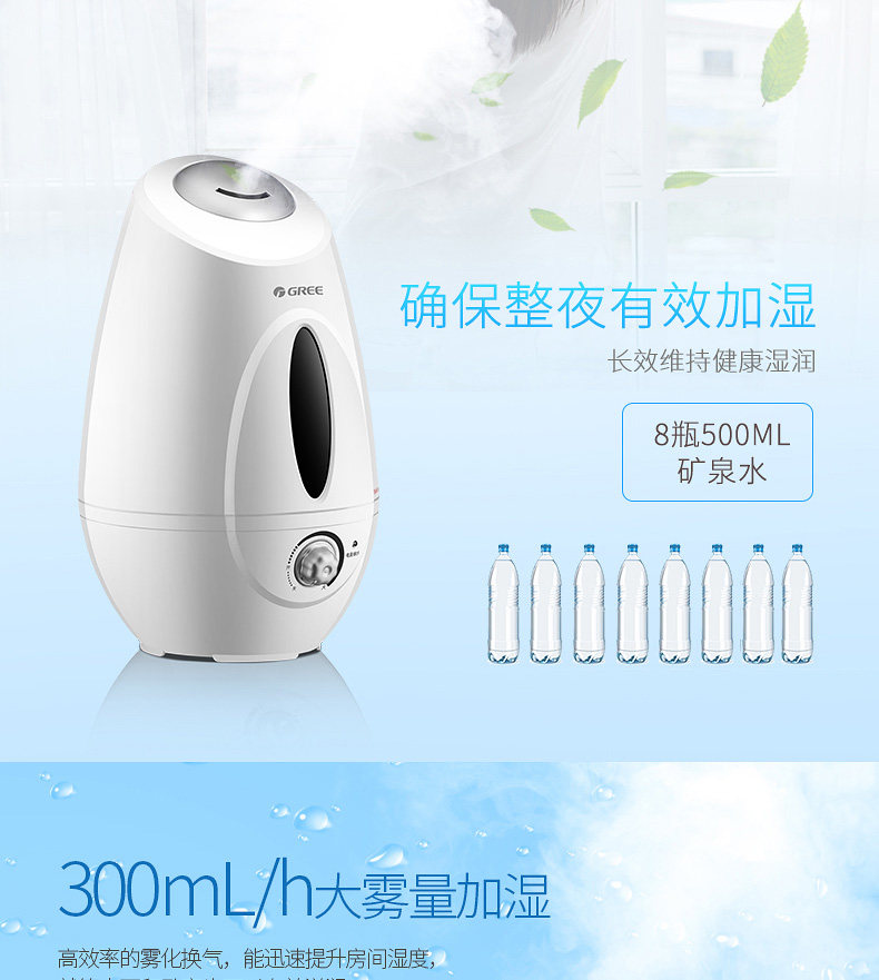 用了这么长时间,出雾量挺大,装1次l晚上正好,北方的冬天有暖气太干,有了这款加湿器好多了,格力值得信赖