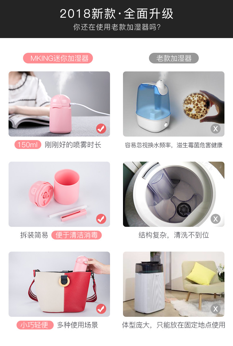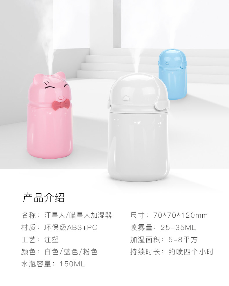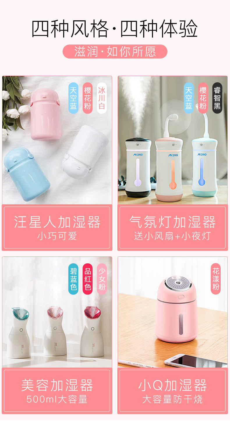 总的来说还是不错的,就是喷雾量没有想象中的大,宿舍里一人一个,用起来也很方便,但是感觉可用的范围在半平方米之间,正常情况下不会有水珠,但是有两次不知道怎么抽疯了,跟下雨一样,加湿器顶上全是水滴,擦掉以后就好了,可能是凝结了一滴在铁片上的原因导致的。每个颜色都不错啦,就是喷雾量不一样,买了三个,白色的和蓝色的喷雾量很大,粉色的就很小,可能是铁片或者加湿棒的原因。