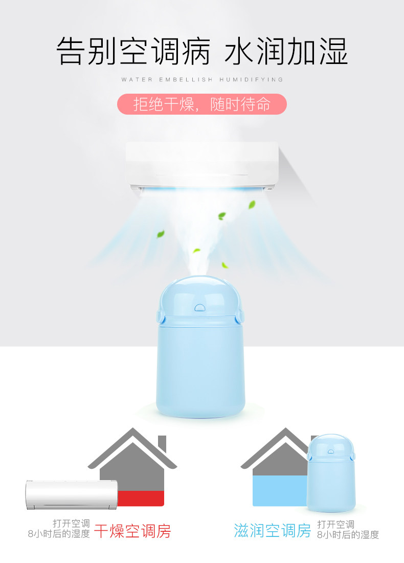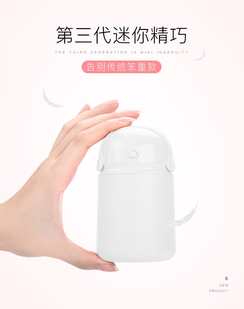 刚刚才收到,看着小巧玲珑的,颜色也和描述一样,我很喜欢这颜色,非常好,很好看 用起来很方便 不错 功能齐全 值得购买,加湿器很可爱,做工精细,拿在手里很舒服,东西虽小喷雾还挺大的,工作起来基本没有噪音,操作也很简单。喷的雾气是真的很细腻的,感觉很舒服开着空调也不觉得干燥,加满水可以使用一整天呢。一边喷雾还散发淡淡的光,亮起来挺漂亮的,是很实用的小东西,值得推荐给大家。