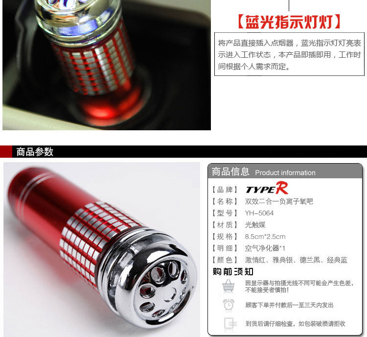 说明:本店所售的这一款是高氧吧,真正有负离子净化功能的车家两用净化器,并非市面上的一些单独只有装饰功能的产品,我们这一款,真正的是装饰+功能2合1功能的。为了自己和家人的健康,用个好的,很有必要,欢迎选购!