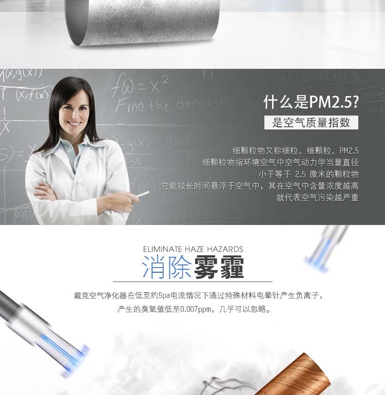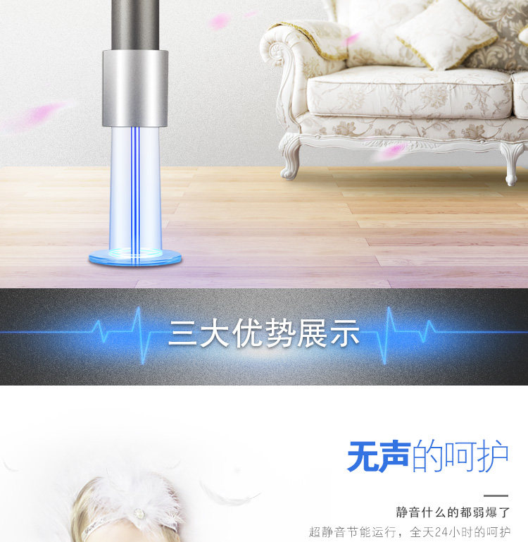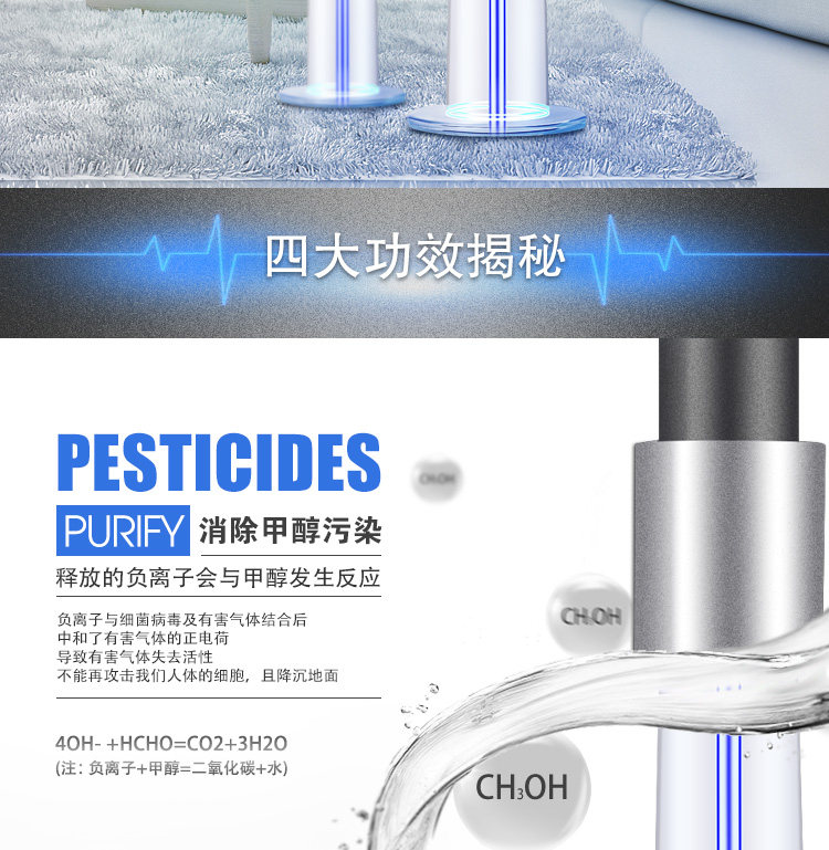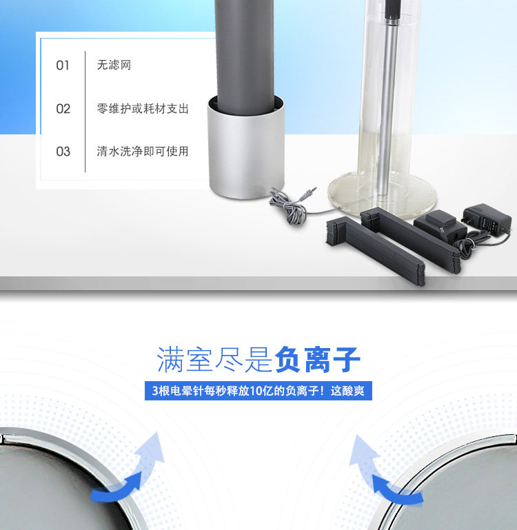 通过离子发生器源源不断地释放出大量有利健康的负离子,带负电的离子可使带正电的烟尘、粉尘、尾气、动物毛发凝聚成团,吸附在空气净化器的集尘设备上,这种技术比把空气抽入机箱层层过滤能更迅速更有效地净化空气。
