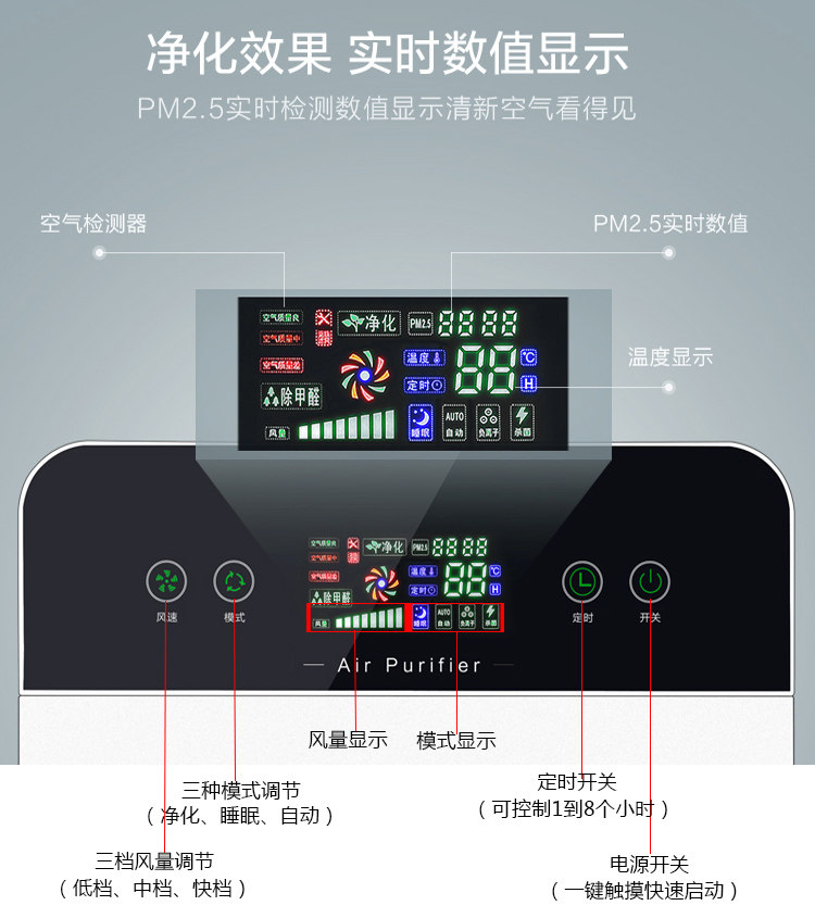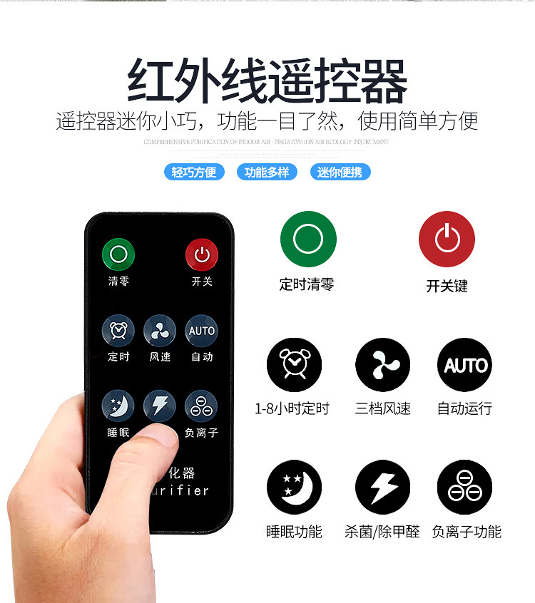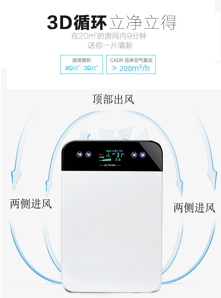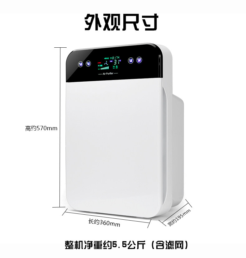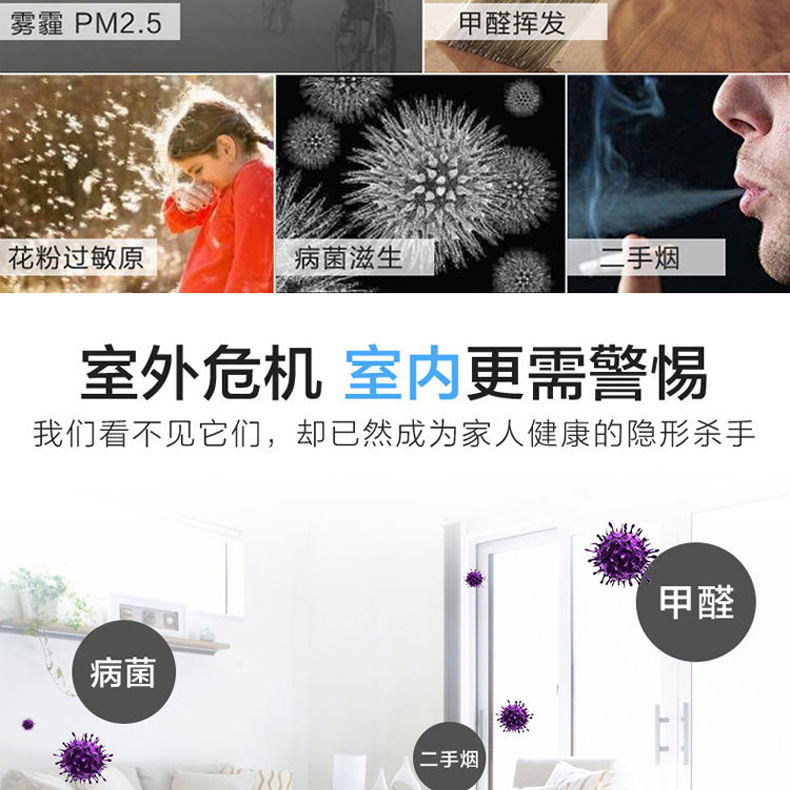 • 功能:定时 除颗粒物 除甲醛 除烟除尘 杀菌 除雾霾 除菌, 负离子 除菌