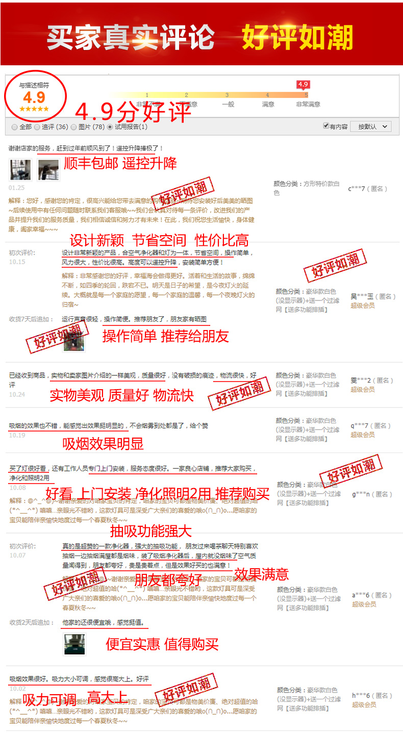 太坑了,不值得购买,最差的一次购物,就一两百的货色,我没当场验货,我绝对不会安装,装了叫没办法。一点过滤效果都没有,还是整房间都是烟,眼睛都张不开了。就一两层过滤棉,像放金鱼缸的。