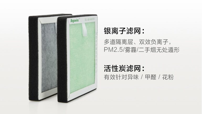 里面有赠送2片滤网,绿色的是银离子滤网,吸收二手烟专用,灰色的是活性炭滤网,吸收甲醛专用,根据自己吸收有害气体的种类来安放滤网!如果放入活性炭滤网,吸收烟雾效果就比较差。千万不要放错滤网。