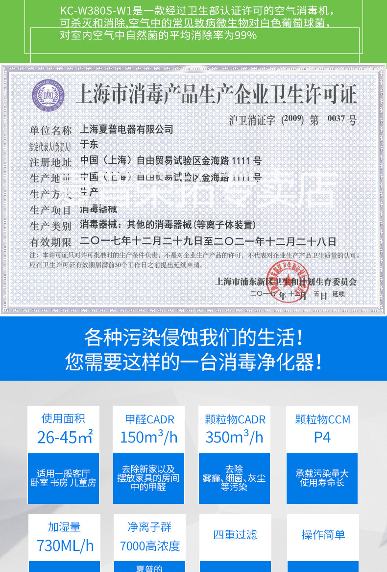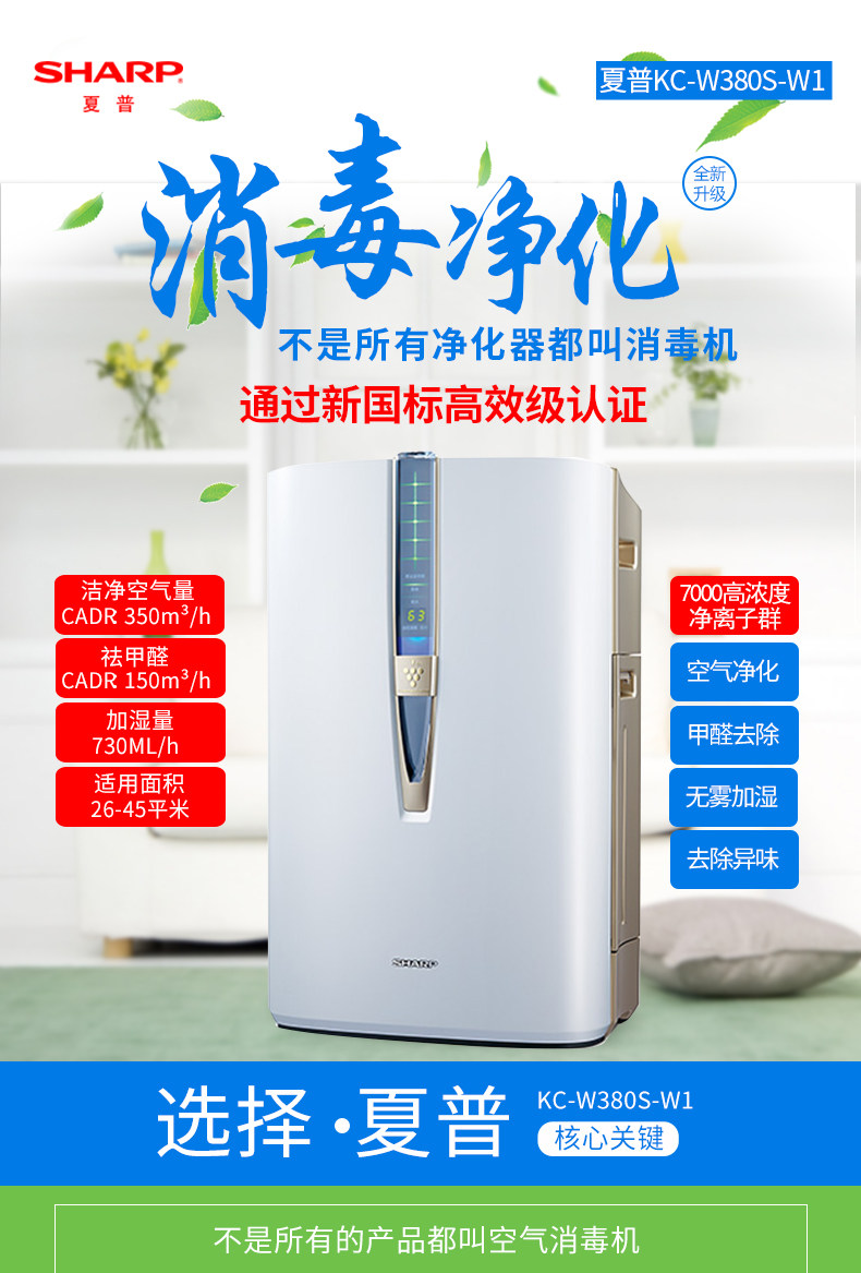 [馨怡电器生活会馆空气净化,氧吧]夏普空气净化器家用KC-W380S-月销量0件仅售1789元