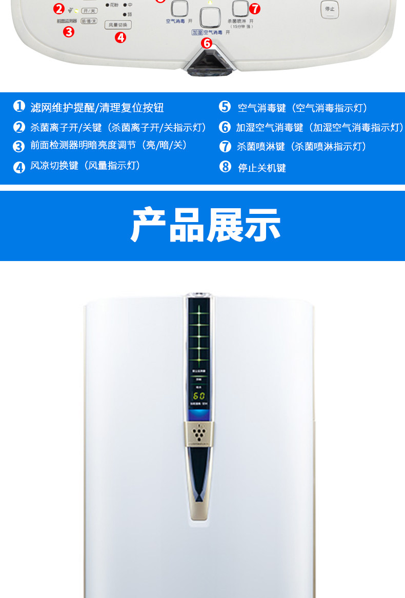 • 功能:除花粉 除颗粒物 除甲醛 除烟除尘 杀菌 加湿 除雾霾 除菌