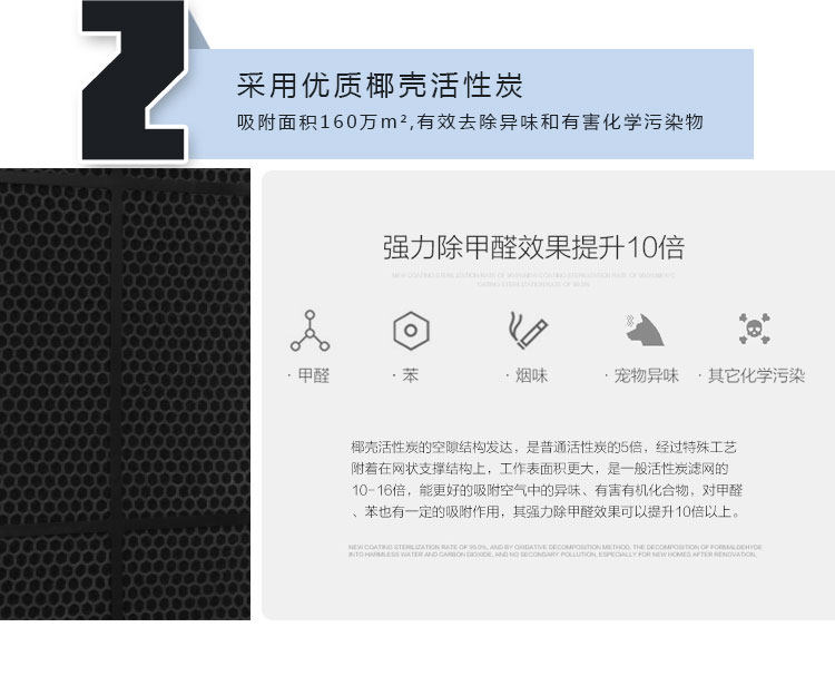 • 滤网特性:过滤PM2.5、微小颗粒物、甲醛、二手烟