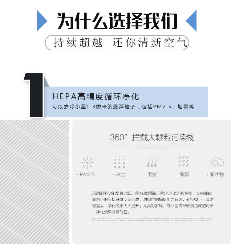 • 滤网材质:最新HEPA过滤技术+活性炭吸附技术