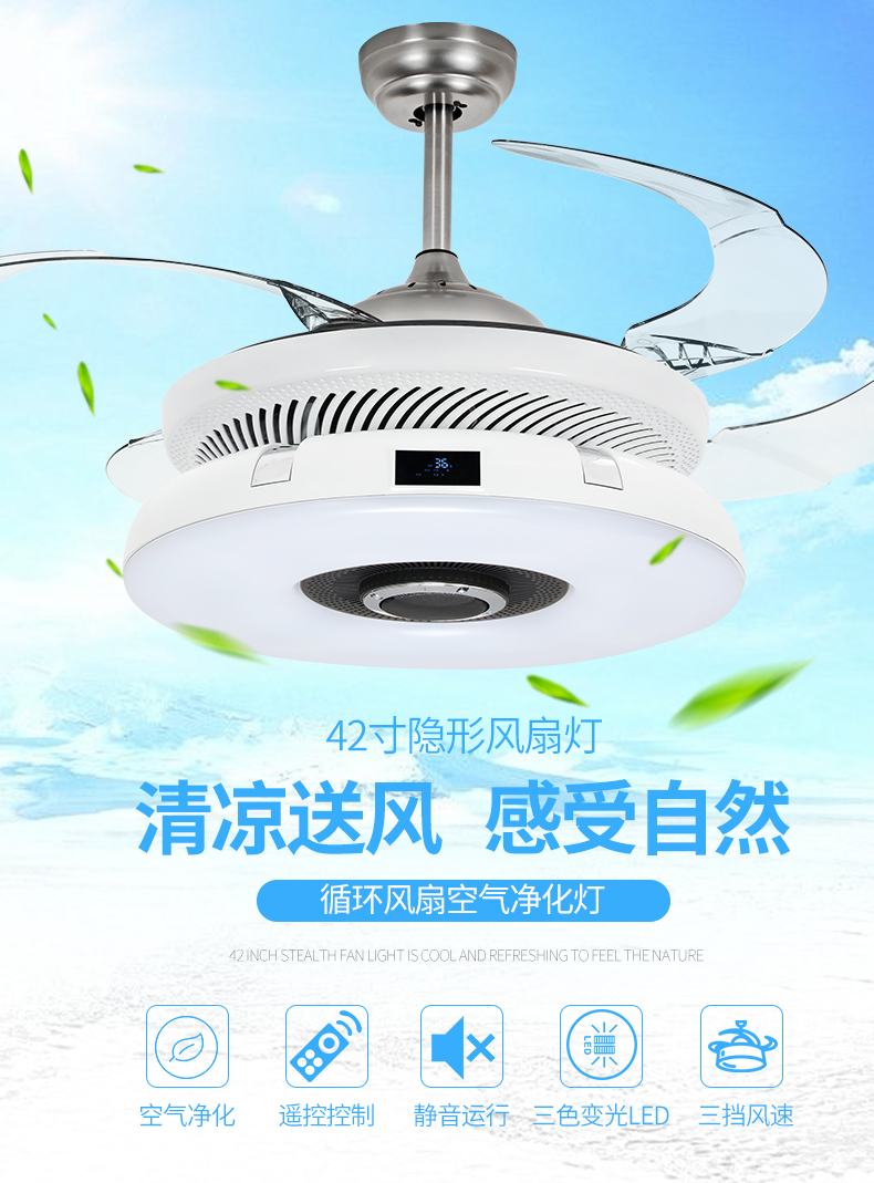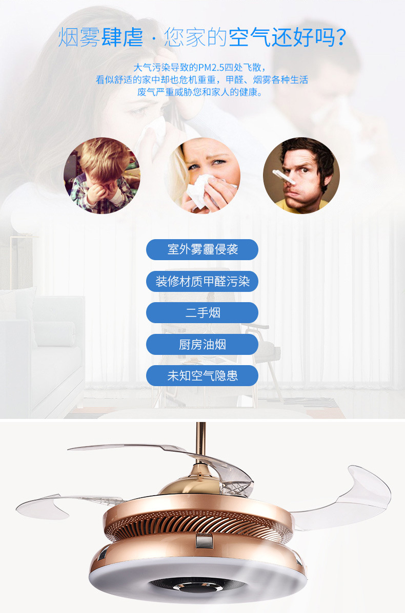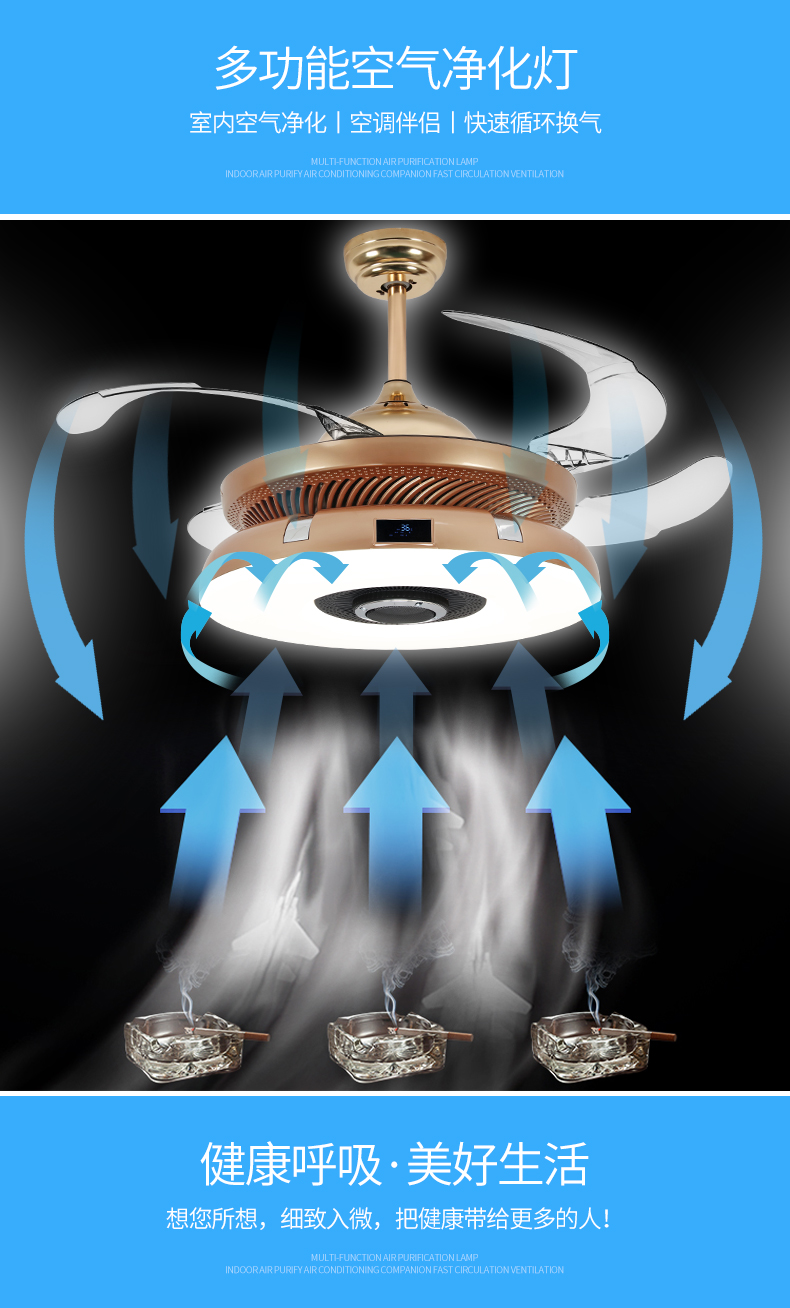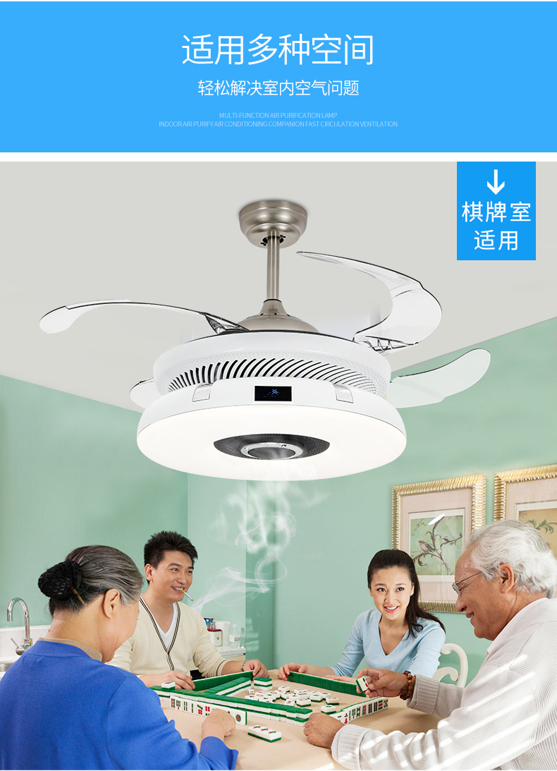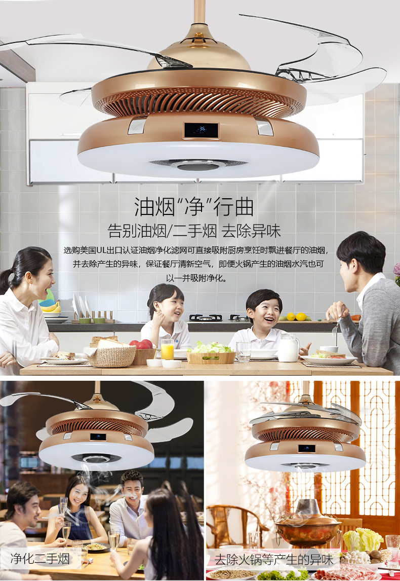 智能带空气净化器隐形风扇灯吊扇灯变频餐厅吊灯吸烟机带蓝牙音乐