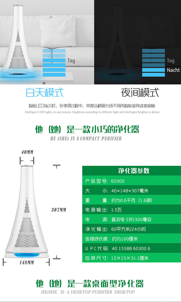 • 空气净化器风量:151-300 立方米/小时