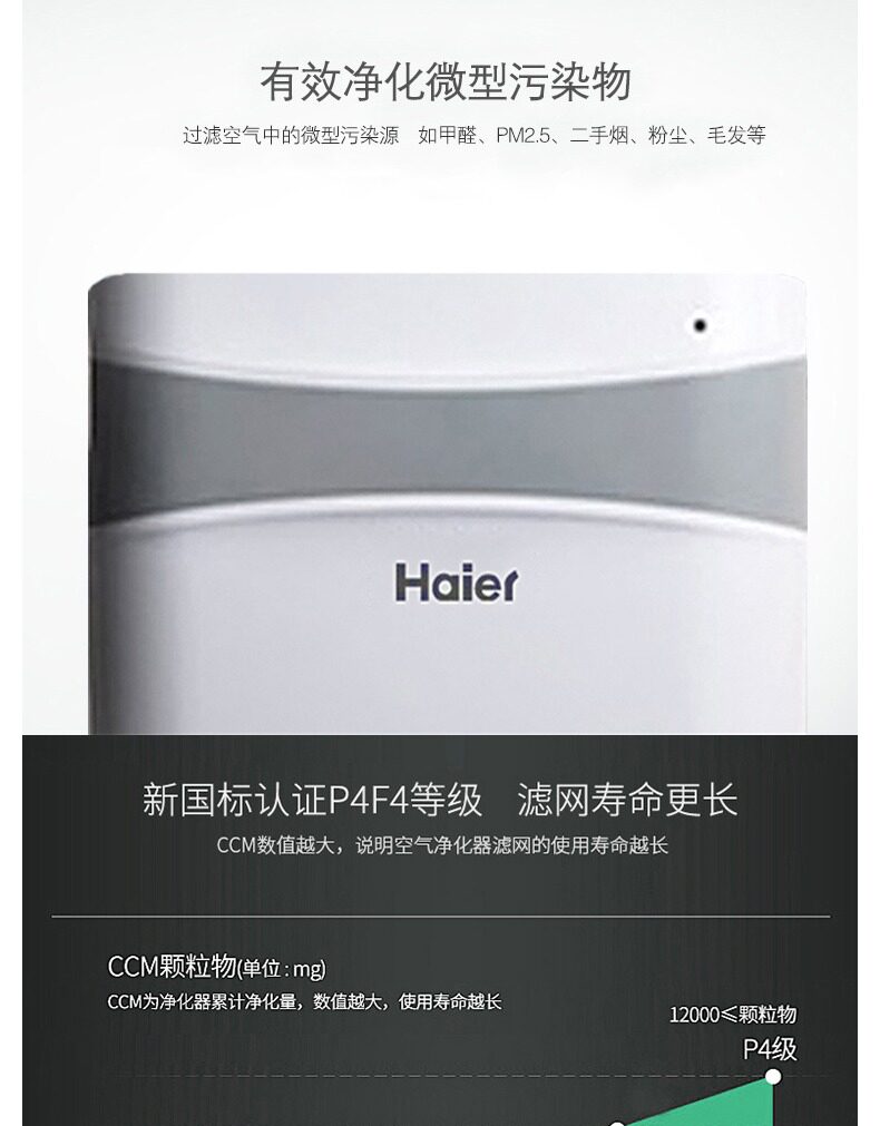 宝贝收到了!特别精致,好用!外观挺时尚的。觉得,符合海尔的品牌!家里重新贴了墙纸,所以想去下甲醛。机器开起来之后确实空气里的味道小了,老婆和宝宝都觉得有了这个净化器,心安很多!