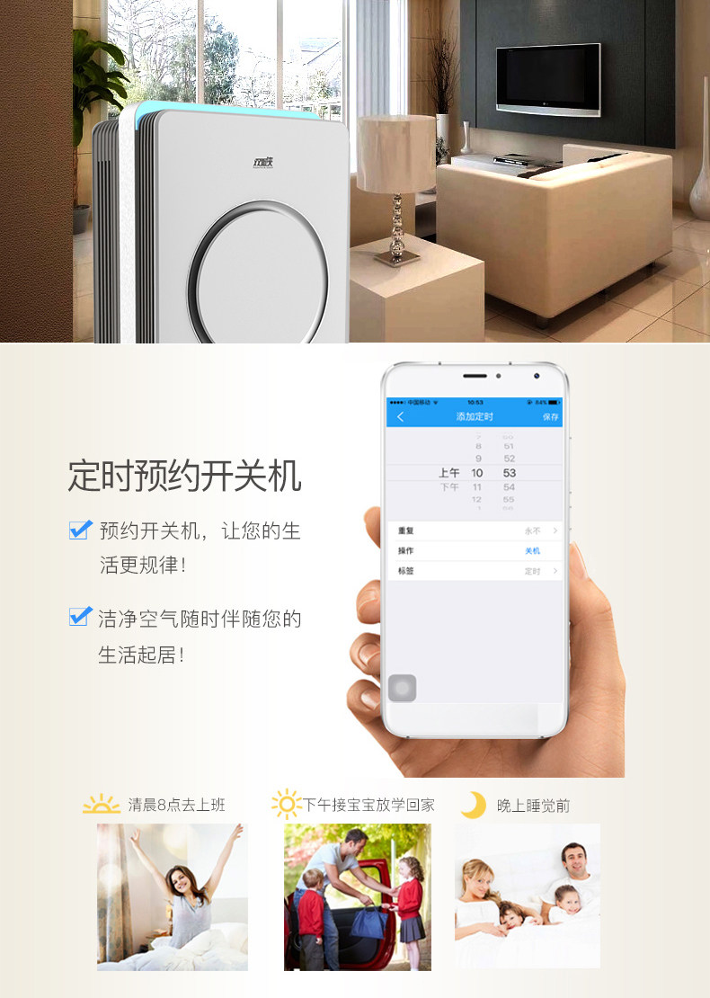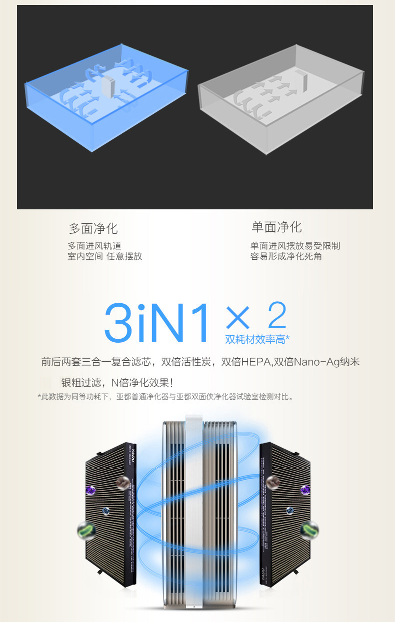 • 功能:定时 除花粉 除颗粒物 除甲醛 除烟除尘 杀菌 除雾霾 除菌