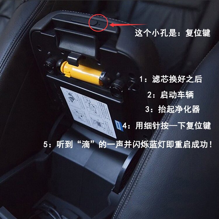 注意:本田原装空气净化器更换新滤网之后,需重启净化器,操作方法:开启车辆电源,翻起空气净化器,用回形针插入孔,听到蜂鸣器(滴)一声并看到显示器闪烁蓝灯,则空气净化系统重启成功。如重启后指示灯仍为红色或者黄色则为机器使用污染过度,净化器检测探头都污染严重,很脏,净化器功能仍然是正常的。需要清洁,到洗车店借用风枪喷吹干净入风口即可(只要更换了新滤网,如仍显红黄提示灯并不影响正常净化器功能,请放心使用!如需转蓝灯请按上述方式操作)