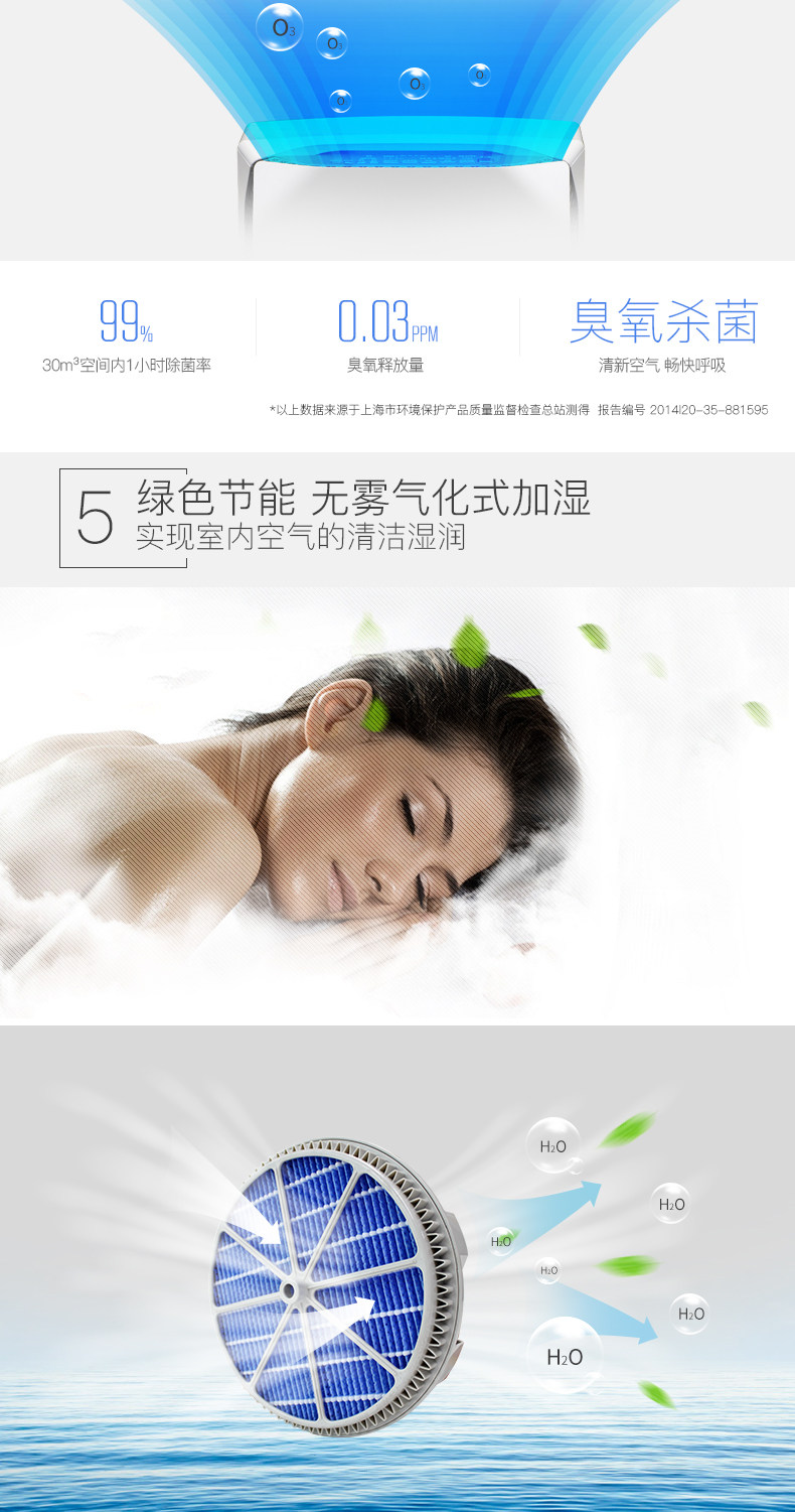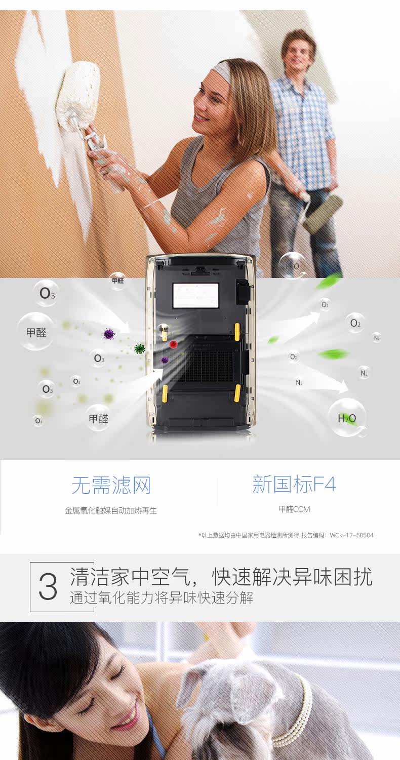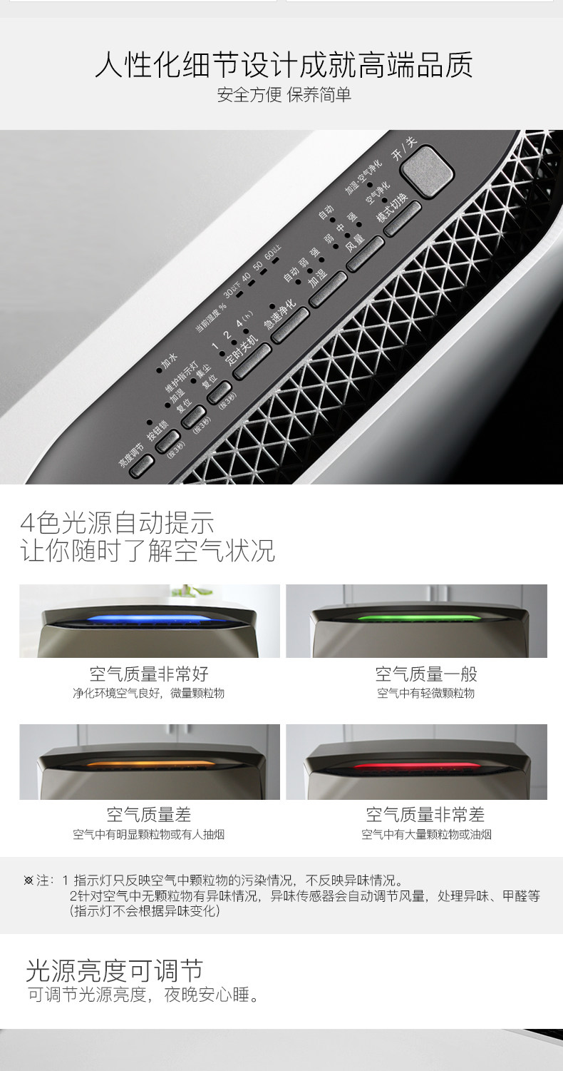 • 功能:定时除VOC除花粉除颗粒物除甲醛除烟除尘杀菌加湿除雾霾除菌