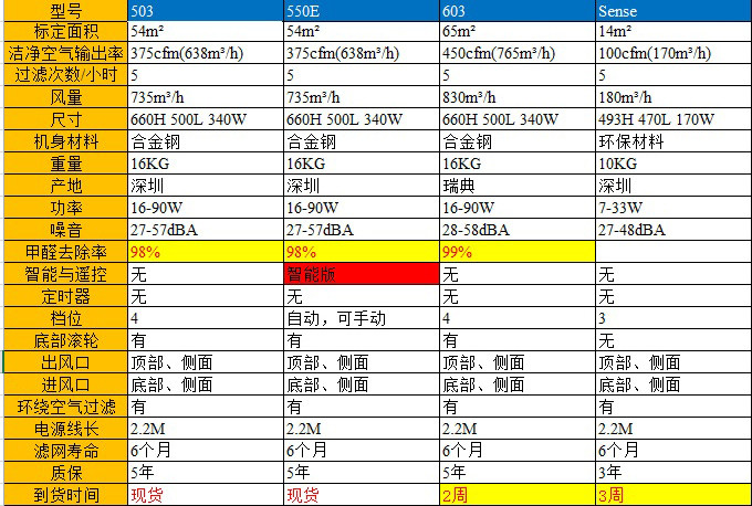 5.型号603为全进口,其他 型号均为国内组装,主要零件为进口件,比如风扇和滤网原材料(具体以官网解释为准)。