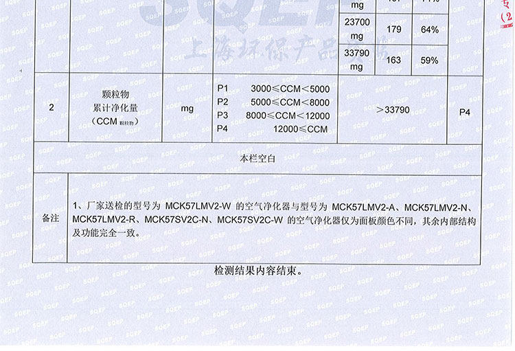 • 颗粒物CCM值:P4(12000≤M)