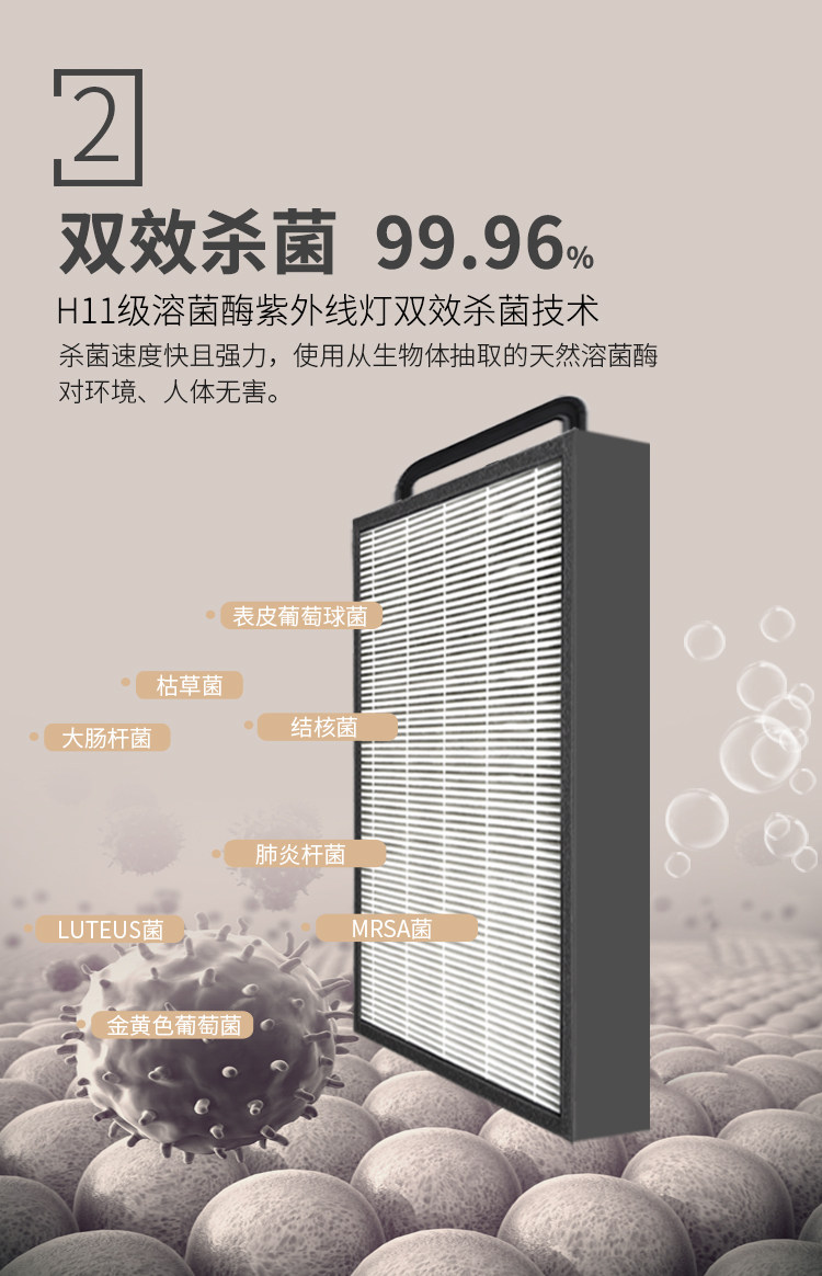 • 工作原理:活性炭 负离子 HEPA技术 紫外线