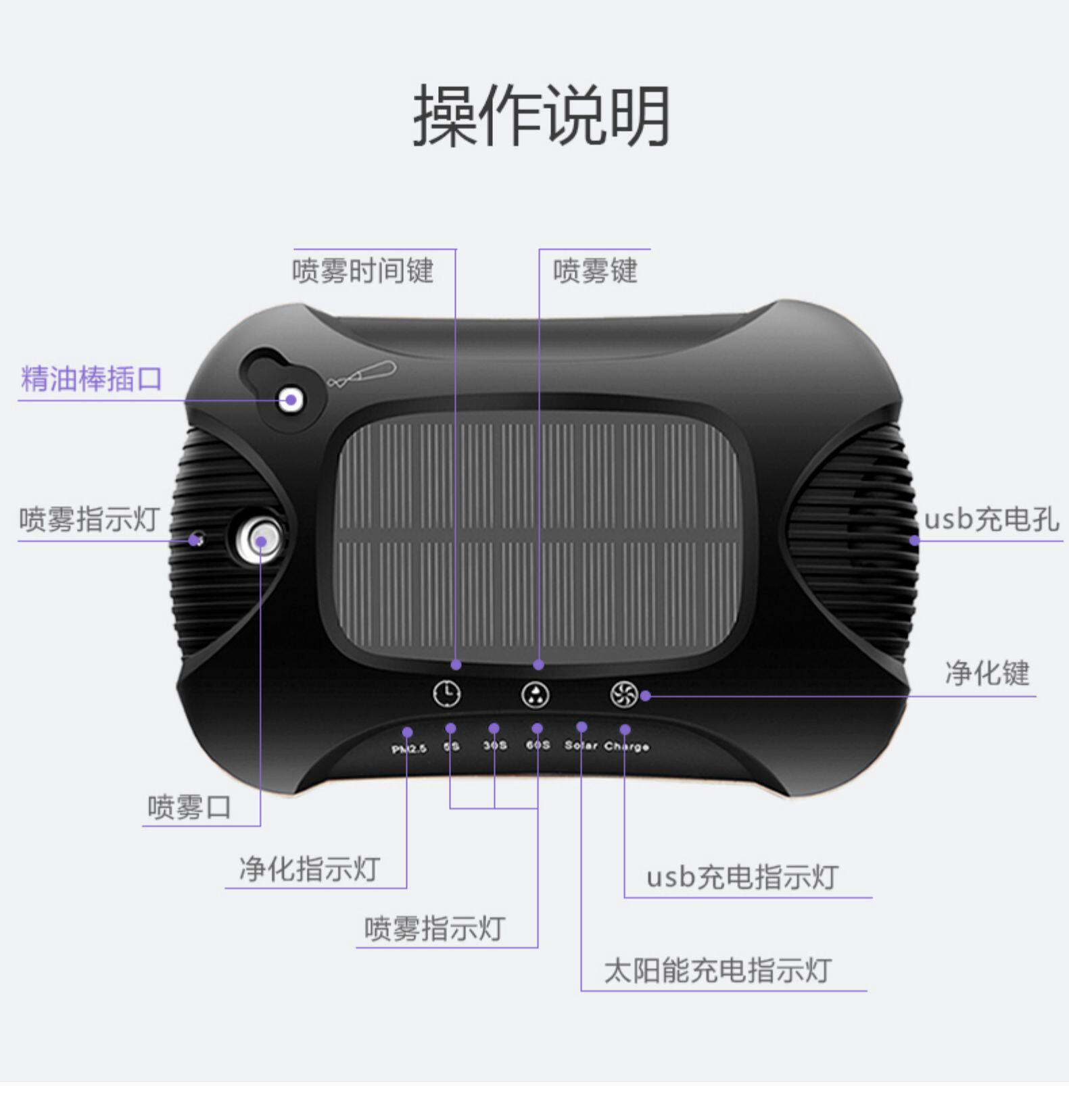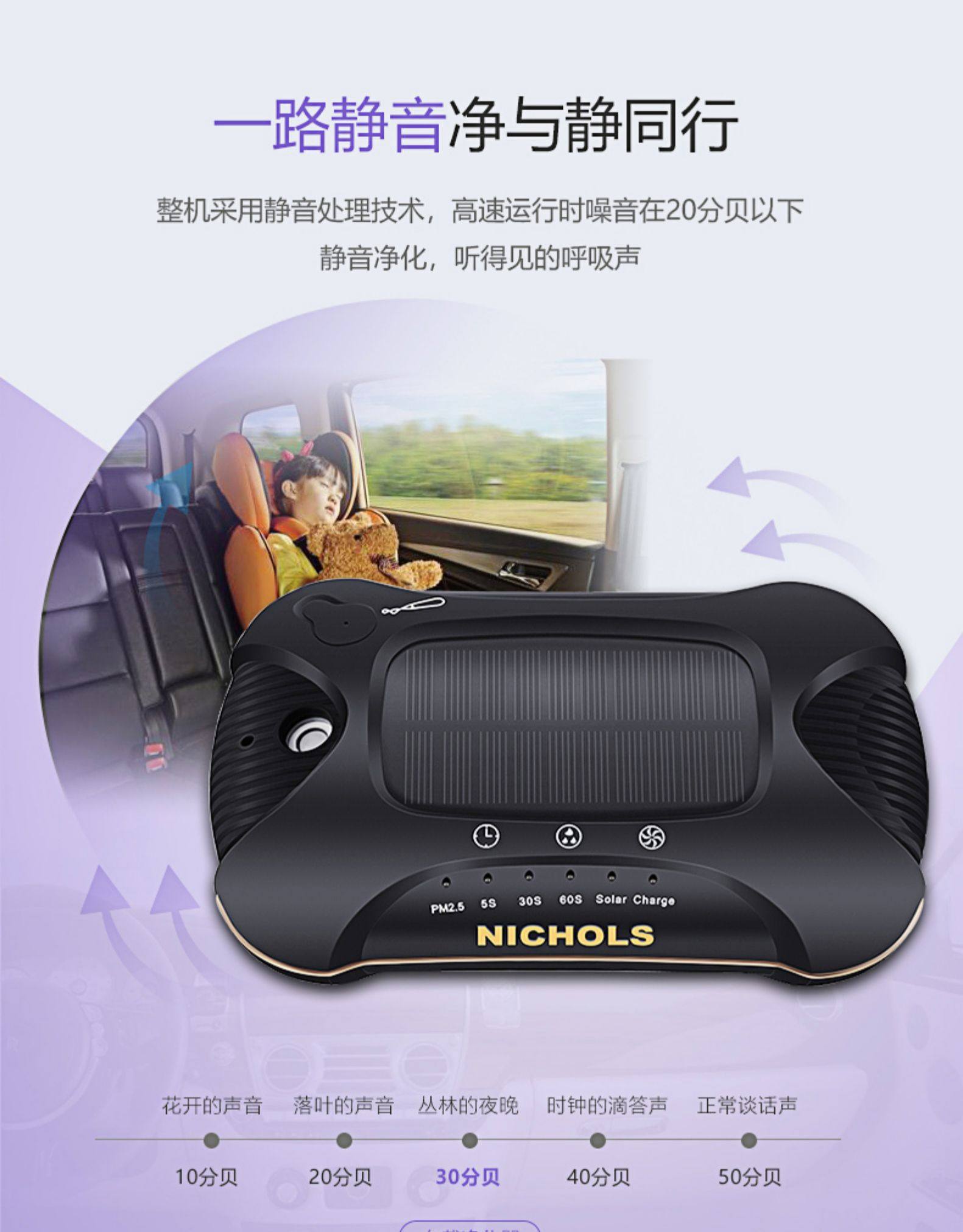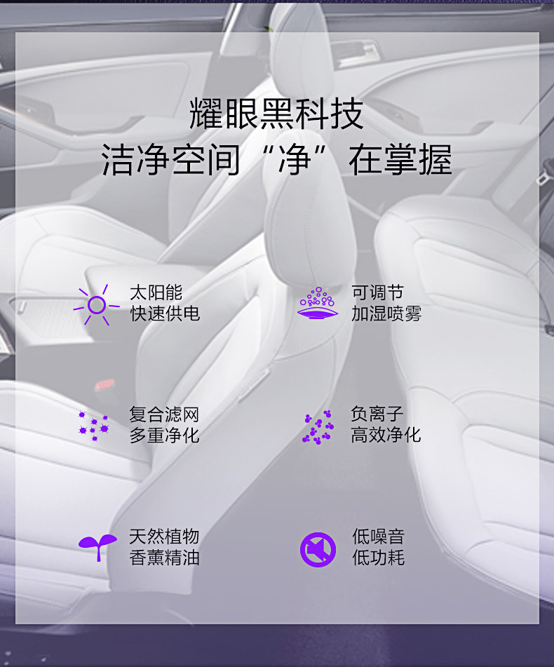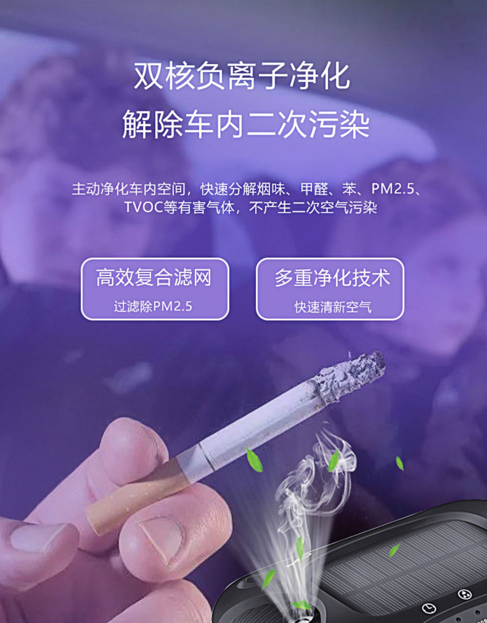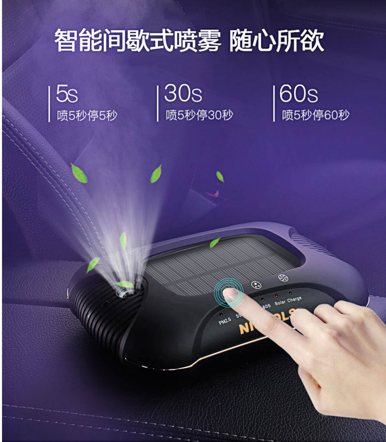 这个产品是很好的,功能齐全,太阳能充电、香薰、空气净化都有;外观设计也很时尚,按钮很方便,触摸反应灵敏。放在新车里一晚上(车里还同时放了活性炭等),车里空气清新了好多好多。香薰打开后,湿润润的,几乎完全静音。店家送的小礼物也让使用更加方便了,非常细心贴心的店家。