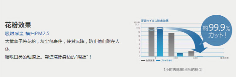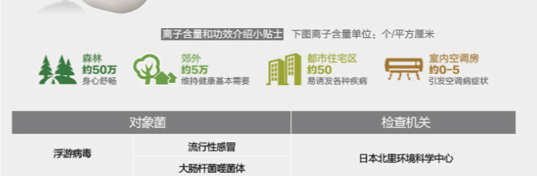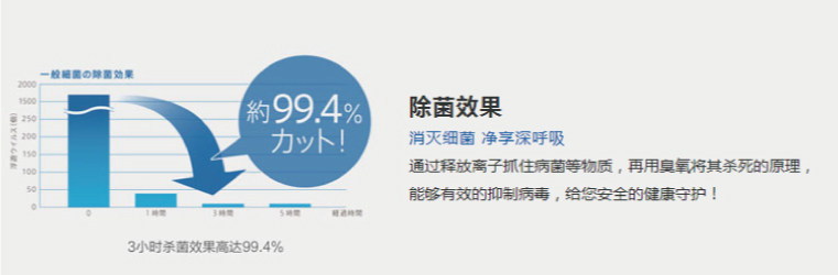 注意事项: 根据使用环境或电池状态可能有所差异 ·本产品具有抑制病毒感染等机能,但不保证预防感染 ·实际效果可能根据室内状况或使用方法有所不同 ·试验结果不保证与在真实空间有同样结果 ·不保证对所有使用者具有同样的效果,各效果可能出现因人而异 ·效果根据季节、周围环境(差异温度、湿度)、使用时间、个人情况有所不同 ·本产品不是医疗器材。 |