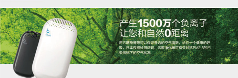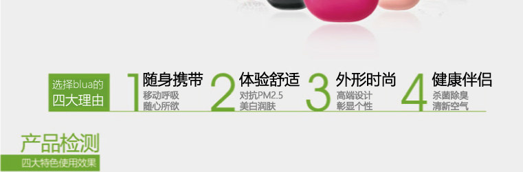 blua是一款可以像项链一样戴在脖子上的便携式负离子产生器。本产品打破了原始的通过滤网或是水净化的原理,通过产生负离子将空气中的浮游粒子吸附,从而达到净化空气的效果。负离子最大产生量每立方厘米约1500万个。杀菌抗病毒,可预防感冒,并且可对抗花粉,粉尘等,对过敏性咽炎,鼻炎等人群有显著效果。还可除烟味,臭味等,并且有保湿润肤功效。本产品专门针对雾霾天气以及PM2.5研制,并已经过多方机关检验证明产品效果。