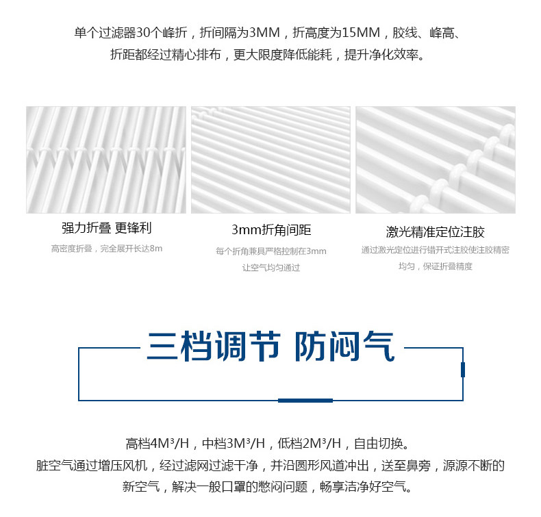 给爸爸买的,带上试了,感觉还可以,开中档就已经没有戴口罩发闷的感觉了,过滤后空气的确要清新很多。