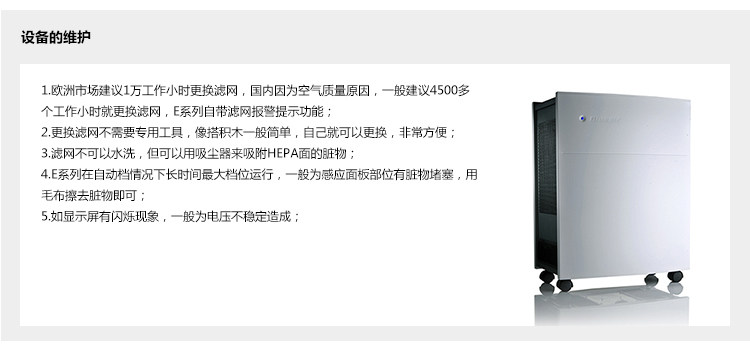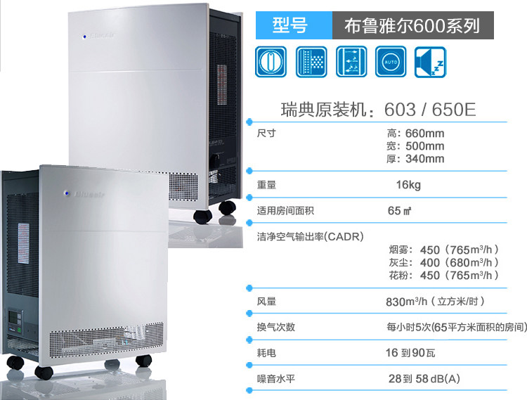 |           1、Blueair是空气净化机是市场上得到AHAM认证,获得高CADR值并具备高性能的空气净化机品牌。 2、专利的HEPASilentTM技术 由于独特的HEPASilent过滤技术,Blueair产品是空气净化机市场中安静的机械式过滤空气净化机。 3、高质量产品及零配件 Blueair产品的外壳是由合金钢制造的,相比塑料而言更加耐久可靠。 4、节能低耗 Blueair是所有产品都获得能源之星认证的品牌。24小时连续运转,耗电量约为0.5度。 5、获得最佳瑞典设计奖 其圆滑弧度并极具现代感的设计可以融入各种室内装修。 6、简易更换过滤网 不需要任何工具。仅需几秒就可以完成更换。 7、零排放 Blueair空气净化机不仅可以去除空气中的污染物,其最主要的另一个好处是它不会产生任何副产品如臭氧。Blueair的所有产品都通过了美国加利福尼亚州空气资源委员会(ARB)的认证,该认证对检测空气净化机排放臭氧的标准是严格的。  E系列和非E系列的区别:E系列为智能机型。能全程智能监控方便您的使用!可遥控选择风速,也可调为自动模式,让机器根据空气质量自行选择风速,并备有滤网更换智能提示,带空气检测提示,定时开关机。 什么是pm2.5? Pm2.5是指大气中直径小于或等于2.5微米的颗粒物,也称为可入肺颗粒物。它的直径还不到人的头发丝粗细的1/20,但它对空气质量和能见度等有重要的影响。与较粗的大气颗粒物相比,PM2.5粒径小,富含大量的有毒、有害物质且在大气中的停留时间长、输送距离远,PM2.5是一种载体,本身可以带病菌,它被吸入肺泡之后随之进入血液,因而对人体健康和大气环境质量的影响更大。 为什么要用空气净化机? 一般情况下,一个人每天需摄入1公斤的食物,饮2公斤的水,呼吸32公斤的空气。据美国环保署的研究,人们在室内呼吸到的空气污染程度是室外空气的2-5倍,有时甚至高达100倍,而现代人几乎90%的活动都是在室内进行的。这些污染物是由于室外的汽车尾气,工业废气等随着窗户的打开进入室内,空气会从缝隙等地方出去,但是大量的颗粒物会留下。由此长时间呼吸被污染的室内空气可以引发人头痛、眩晕、昏厥,刺激人的眼耳口鼻,甚至引发难以治愈的过敏及哮喘等呼吸道疾病,室内空气污染已经成为人类不容忽视的隐形杀手。为解决室内空气污染问 题,美国环保署(EPA)推荐使用空气净化机。 用什么标准来衡量净化机的好坏? 首先看CADR值,这个数值是一个综合的衡量标准。数值越高,机器的总体性能越好。 Blueair 使用了多层渐进式HEPA网和静音悬浮风机。平衡了高效和静音这两个矛盾体。 多层渐进式滤网没有那么稠密,但 又不是很薄,减小了空气通过的阻力,从而降低了噪音。风机降低了大风机的能耗。 综合评价Blueair达到了行业内性能优秀。 HEPA代表什么? HEPA是英文High Efficiency Particulate Air的缩写,意思是高效空气过滤。达到HEPA标准的过滤网,对直径为0.3微米以上的微粒去除效率可达到99.97%以上,是烟雾、灰尘以及细菌等污染物有效的过滤媒介。Blueair专利的HEPASilentTM(高效无声过滤)技术可以有效清除通过滤网的0.1微米以上大小的悬浮粒子达到99.97%。 为什么Blueair不会产生臭氧? Blueair的机器很多人都了解是多层渐进式滤网和静电吸附相结合的方式,行业内的其他静电技术都是利用正负极的高压产生静电,电压高达8000-12000伏,这种高压静电的电离作用会产生大量的臭氧。而Blueair利用静电毛刷(离子发生器)使空气中的颗粒物带负电,而滤网(聚丙烯材质)本身带磁性,污染物就吸附在我们的滤网上,并且渐进式的拦截,达到净化的功效。电离确实会产生很少量的臭氧,blueair同时还使用封闭的钢罩包裹离子室,臭氧分子在离子室内与钢碰撞的时候,其中很多的第三个氧原子就碰掉了,因而又变回到原来的一般的氧,不再是臭氧了。所以这样的方式是不会产生臭氧。Blueair静电系统对健康没有威胁,即使对于那些有呼吸系统疾病的人都毫无妨害。 使用空气净化机会降低免疫力吗? 使用空气净化机不但不会降低人体免疫力,而且将促进人体免疫力的自我修复。 首先免疫力下降主要是由于各种压力,空气污染、食用不健康食品等因素导致人体亚健康的产生。但人体是具有自我修复能力的,所以如果能够在清洁的空气环境中生活工作,您身体的自我修复将得到重要的帮助。 晚上睡眠和休息的时候是人体自我修复排出毒素的最佳时间,也是人体免疫系统最低迷的时间,如果您能伴着洁净的空气入睡,将更有利于您身体的自我修复及睡眠质量,长此以往也将有助于人体免疫力的恢复和提升。 你们的机器可以24小时持续开机吗? 当然可以!我们建议您24小时开机,因为空气中的污染物是在不断的产生,比如甲醛,TVOC,毛发等。另外,Blueair采用的是静音悬浮电机,专供航空、医疗和通信行业。连续工作50000小时不用关机,使用寿命长达10年以上。  欧洲的品牌讲究性能和质量,日韩品牌为了迎合消费者注重外观;中国品牌看重成本。 Blueair的技术,材料,制造工艺都比较讲究,制造成本比较高,如:外壳采用合金金属外壳,外面烤漆,坚固牢靠,比其它品牌采用的塑料外壳高档的多。电机采用静音悬浮电机,可以24小时连续运转10年以上,就这点没有几个品牌可以做到;为了降低噪音,甚至在风扇叶片上做了动平衡处理。种种措施,所以售价也略微高一些,但性能和质量无可挑剔,全球消费者都对它非常认可,几乎没有消费