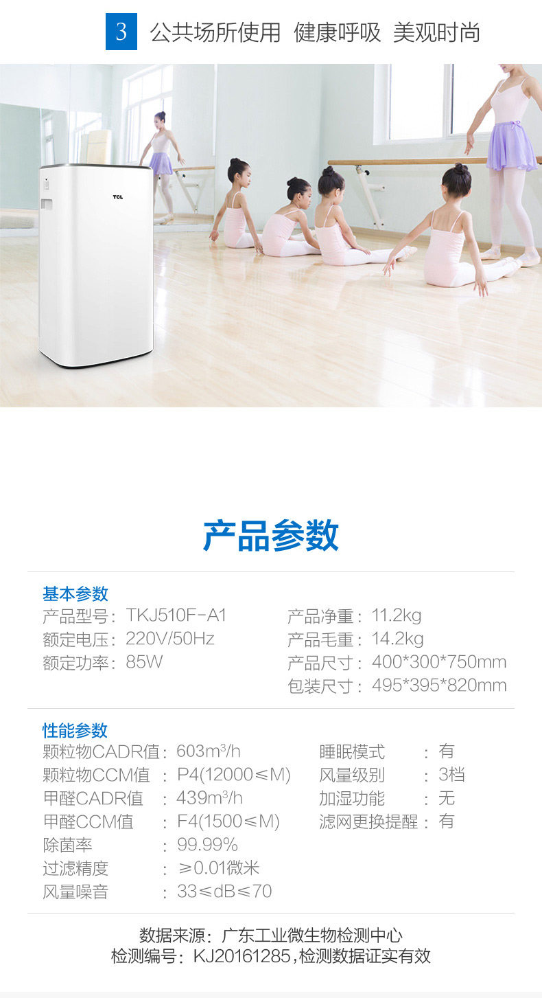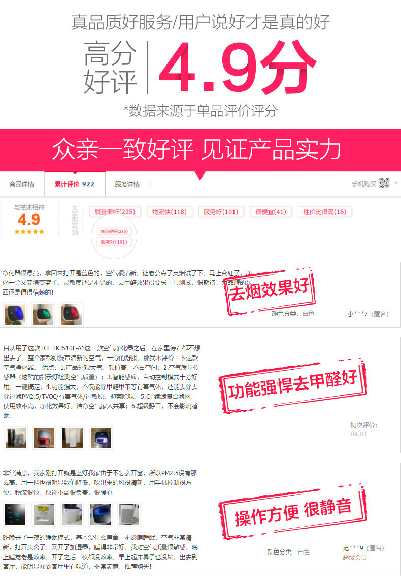 外观细节比较到位,本来想买小米,查了下网上数据,质检总站对空气净化器有调查报告,就选了tcl,后续使用再看看效果如何