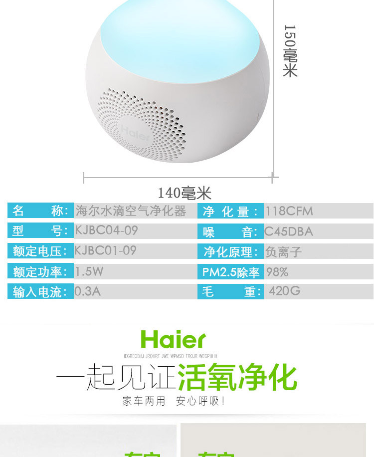 [海尔净化专家空气净化,氧吧]海尔桌面空气净化器迷你小型家用负离子月销量3件仅售299元