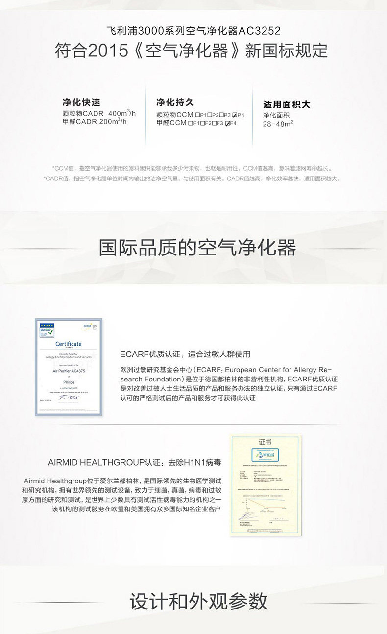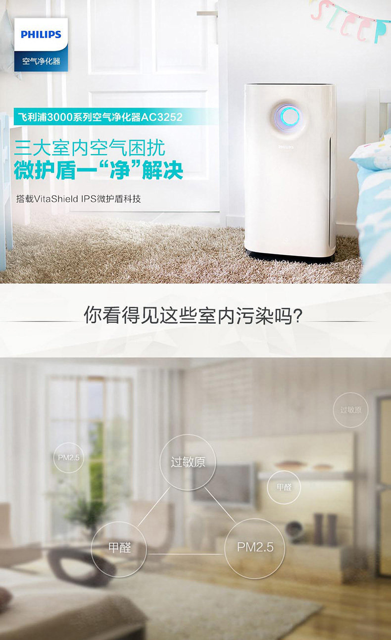 飞利浦空气净化器AC3252家用室内卧室除甲醛雾霾烟尘PM2.5办公室