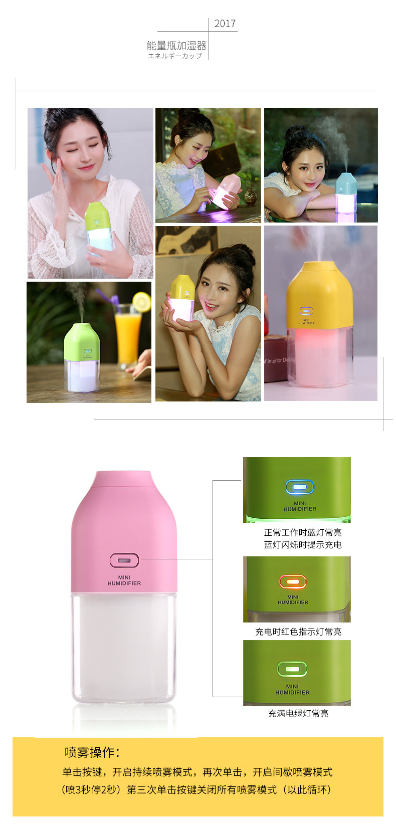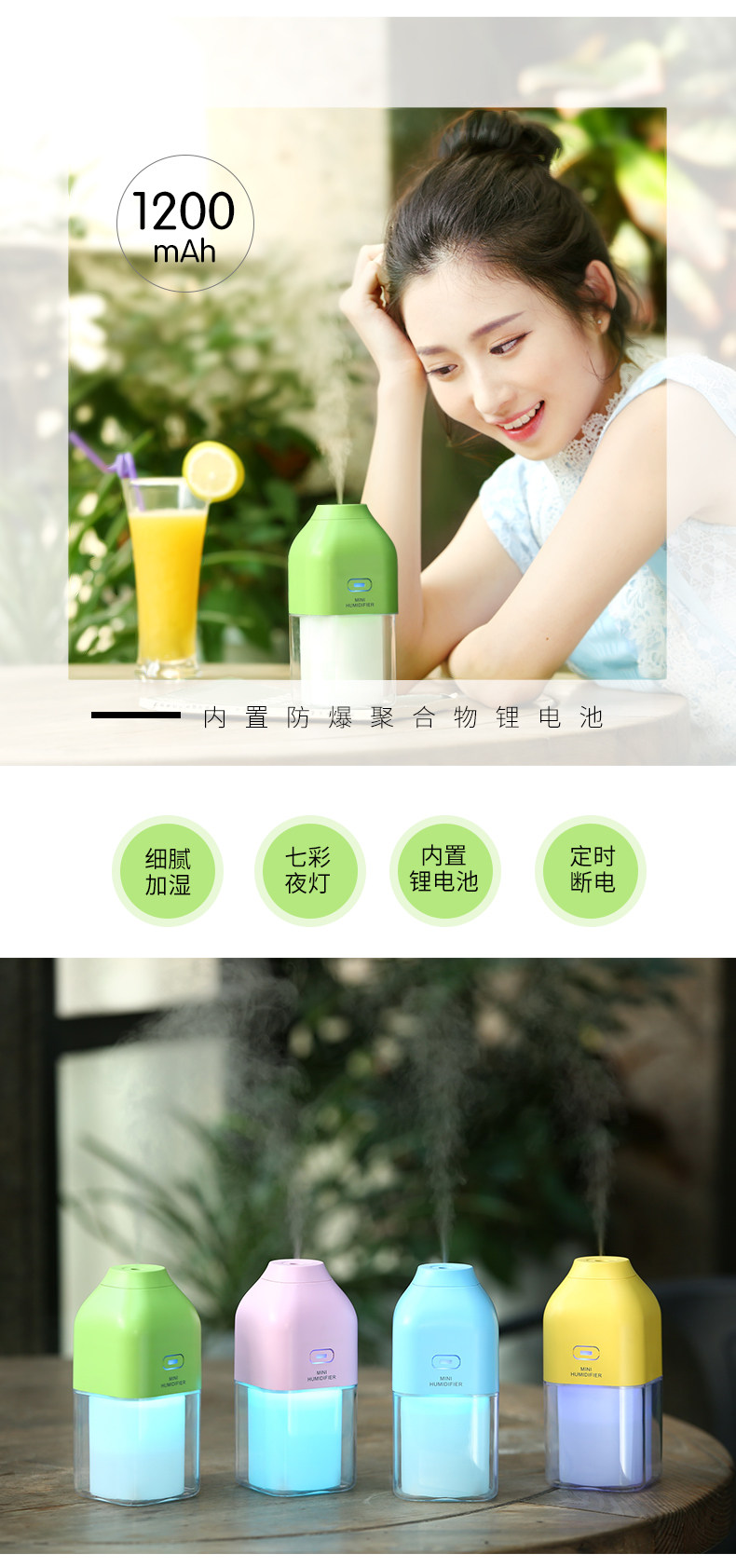 静音,七彩夜灯,可充电,颜值高,冬天放车上开暖风时用实在太好了,皮肤不干了!