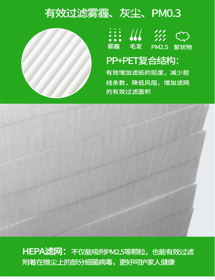 • 功能特性:过滤微小颗粒 PM2.5 二手烟