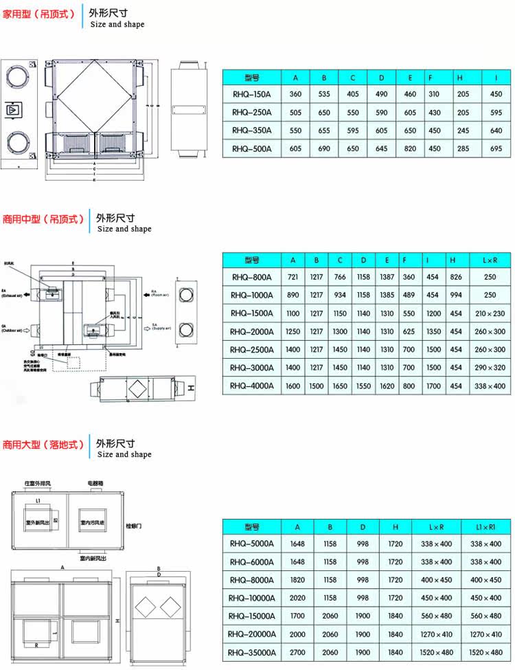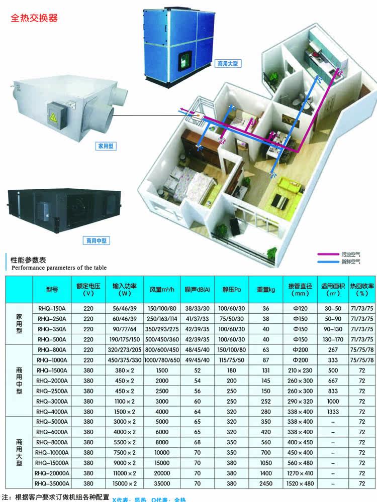 多种机型,适合从15~1500m2建筑单元,一体化结构,内置热交换器,双风机,过滤器,只需接通电源和风道即可使用。