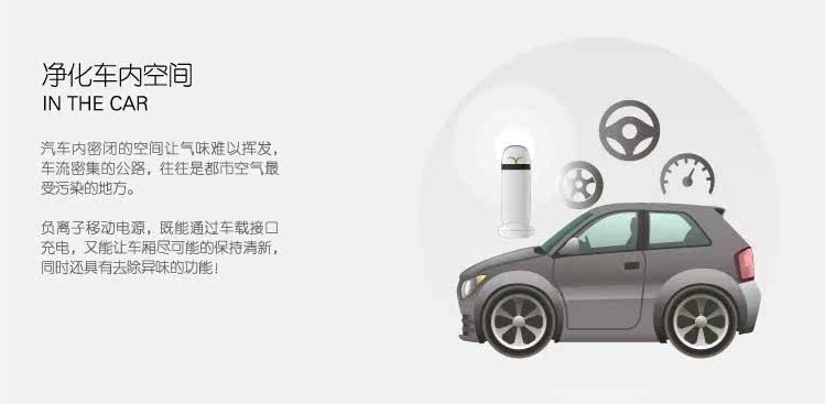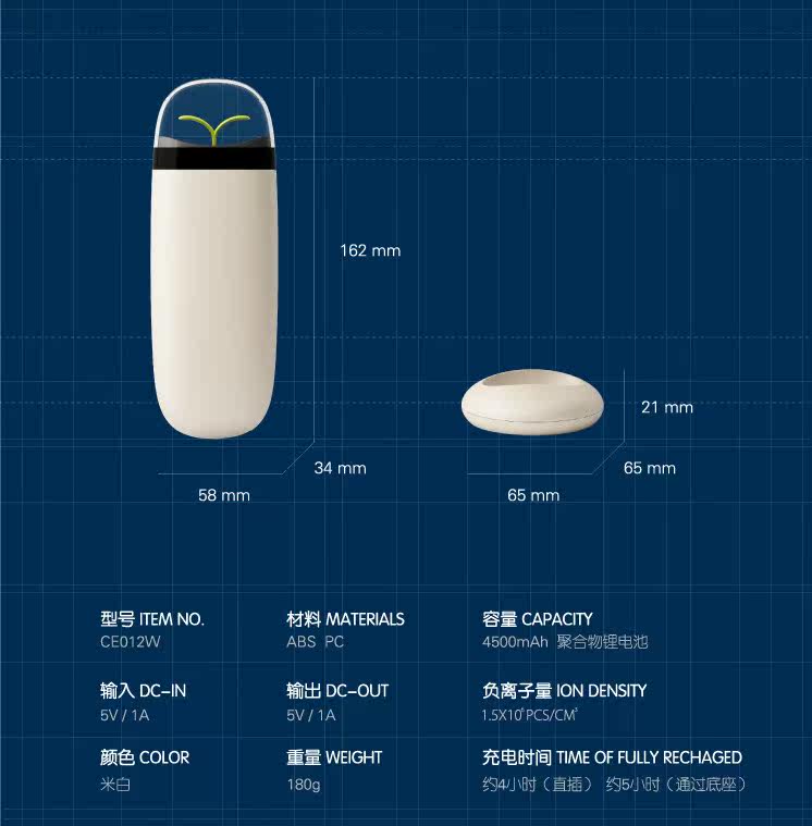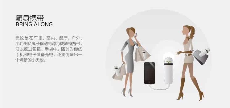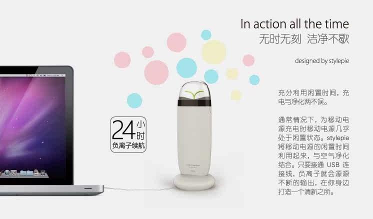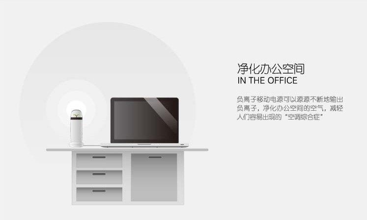 EVE移动净化宝,是一款全新的带有负离子空气净化功能的移动电源,让源源不断的能量与清新空气时刻相伴。它配备了4500毫安的聚合物锂电池移动电源,能随时给手机或电子设备带去充足的能量。无论是在车里、室内、餐厅、户外,小巧的空气净化器方便随身携带,随时工作。除了一键启动净化功能外,它还能智能地利用充电时间,只要通过USB线或者底座接通电源,就会在充电的同时开始源源不断地输出负离子,净化空气,去除异味。造型来自大自然的灵感,同时先进的人体工学带来最舒服的握感。月亮显示指示灯,呼应自然,阴晴圆缺的渐进,让电量一目了然。