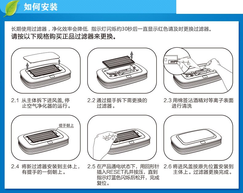 关于复位,复位与滤网是没有半毛钱关系的,机器里头有芯片计时,累计一定时长亮红灯,更换滤网后复位,滴一声,灯光即从红色转成蓝色,复位成功。偶见几个客户灯光是黄色,是由于滤网太长时间未更换,导致机器的传感器不灵敏,无法检测,用气枪或强风吹吹清理即可,如果还是不行请联系经销商。