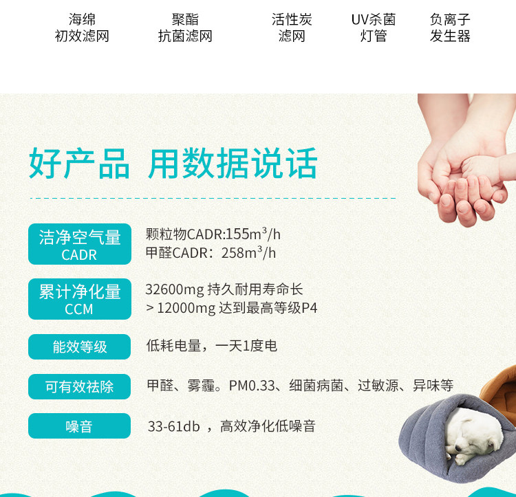 • 工作原理:HEPASilent专利技术 静电技术 活性炭 负离子 HEPA技术 光触媒